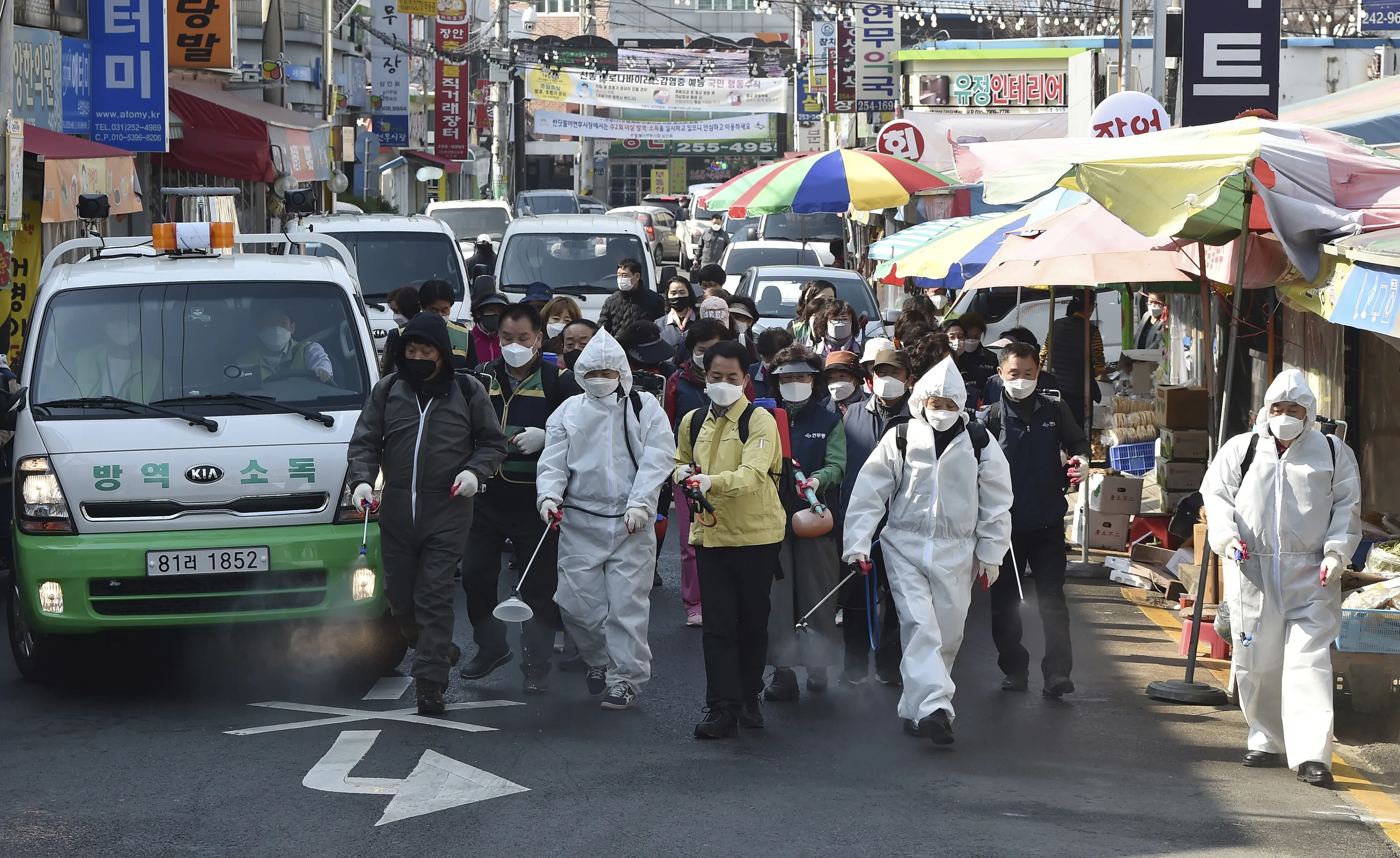 Residents spray disinfectant as a precaution against a new coronavirus at a traditional market in Suwon, South Korea, Wednesday, March 25, 2020. (Photo by Kim Jong-taek/Newsis via AP Photo)