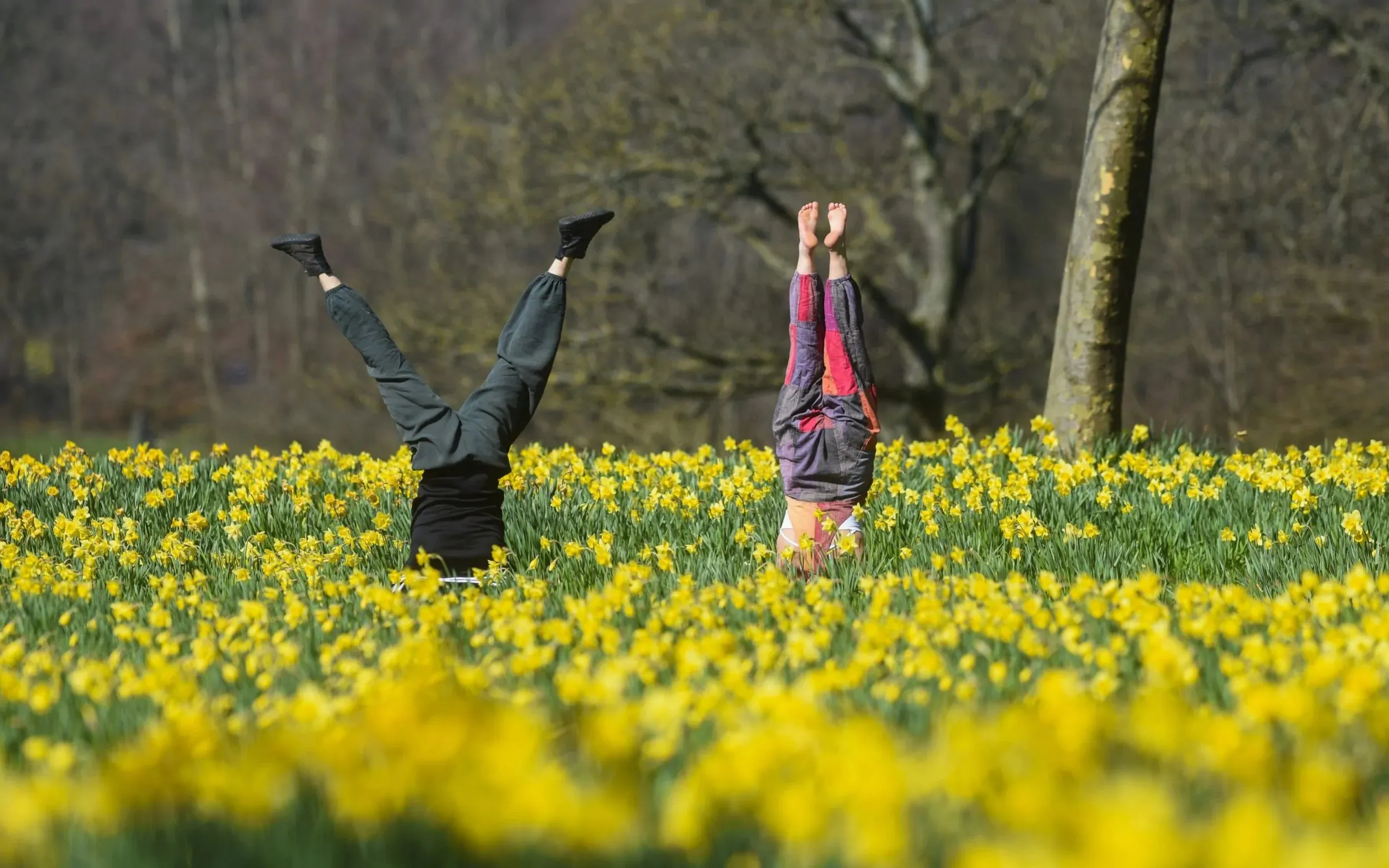 A couple do a handstand among the daffodils in Sefton Park in Liverpool, England on March 25, 2020. (Photo by Iain Watts/Mercury Press)