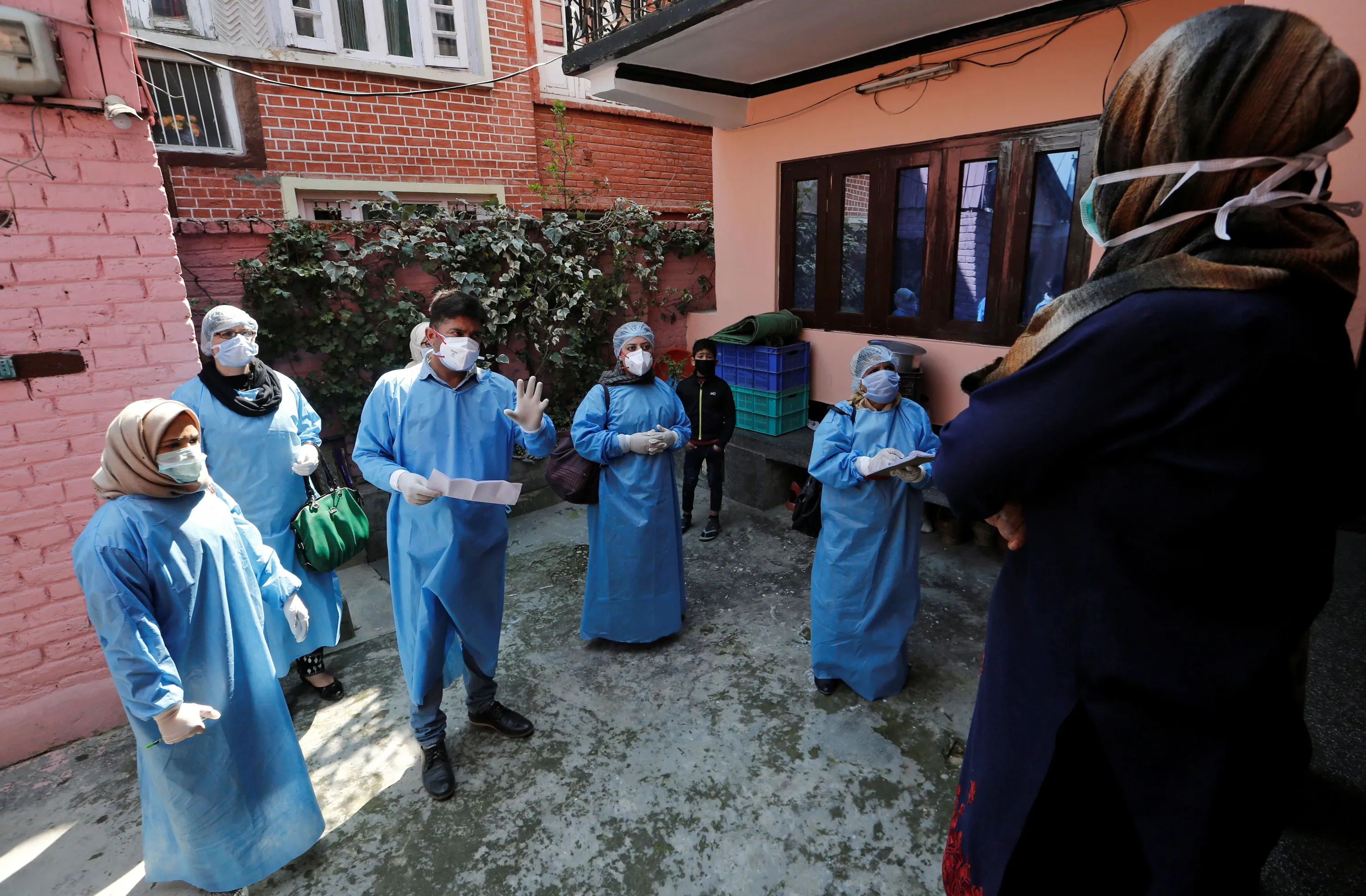 Members of a medic team wearing protective suits give information to the residents about coronavirus disease (COVID-19) during an awareness campaign in Srinagar March 19, 2020. (Photo by Danish Ismail/Reuters)