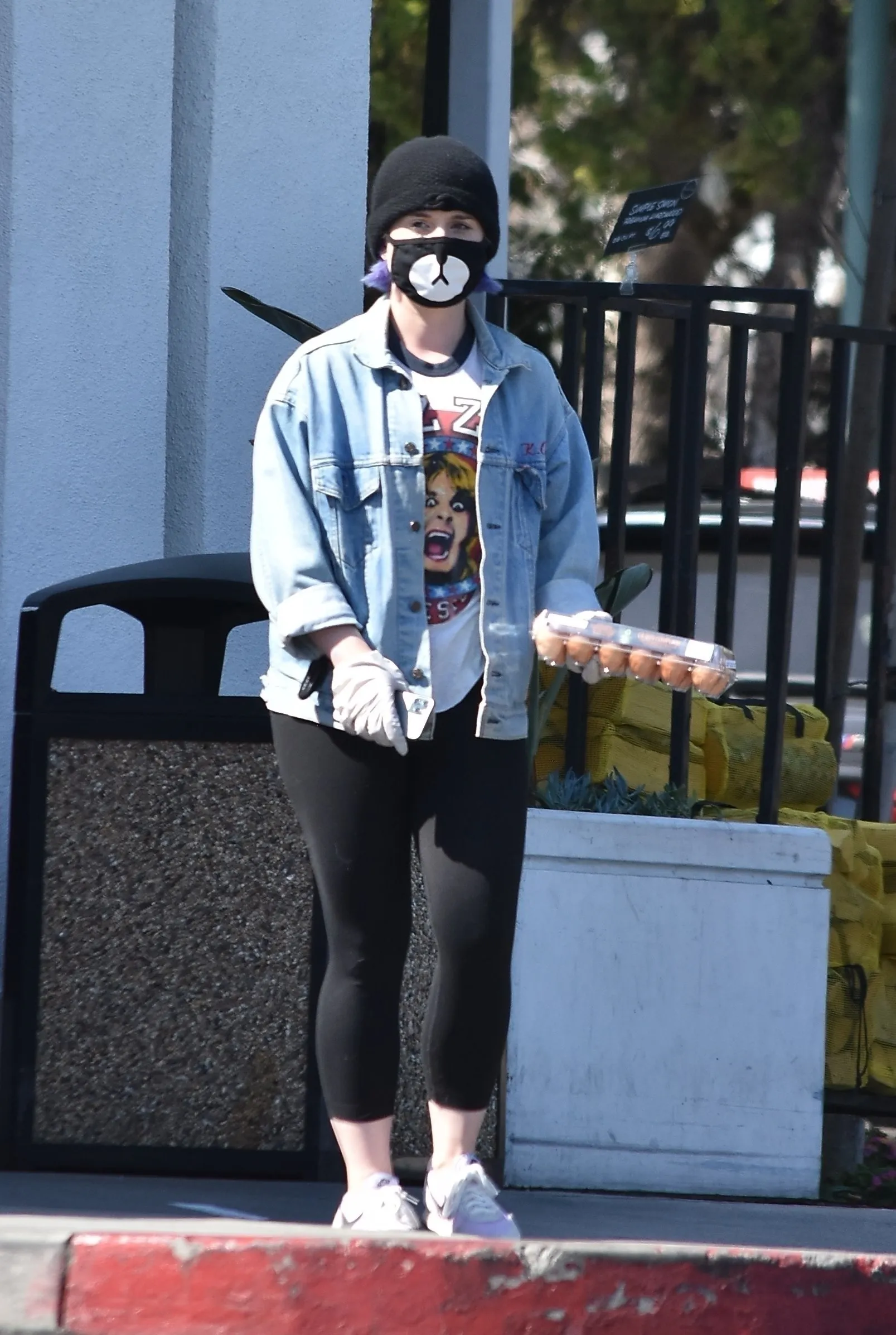 Kelly Osbourne stepped out for a short trip to the market this afternoon, only to walk out with just a dozen eggs in Los angeles, CA. on March 26, 2020. Kelly used precaution using a face mask and wore latex gloves for her safety. Ozzy's daughter was seen sporting an OZZY FOR PRESIDENT t-shirt with the iconic singer's image on it. (Photo by Backgrid USA)