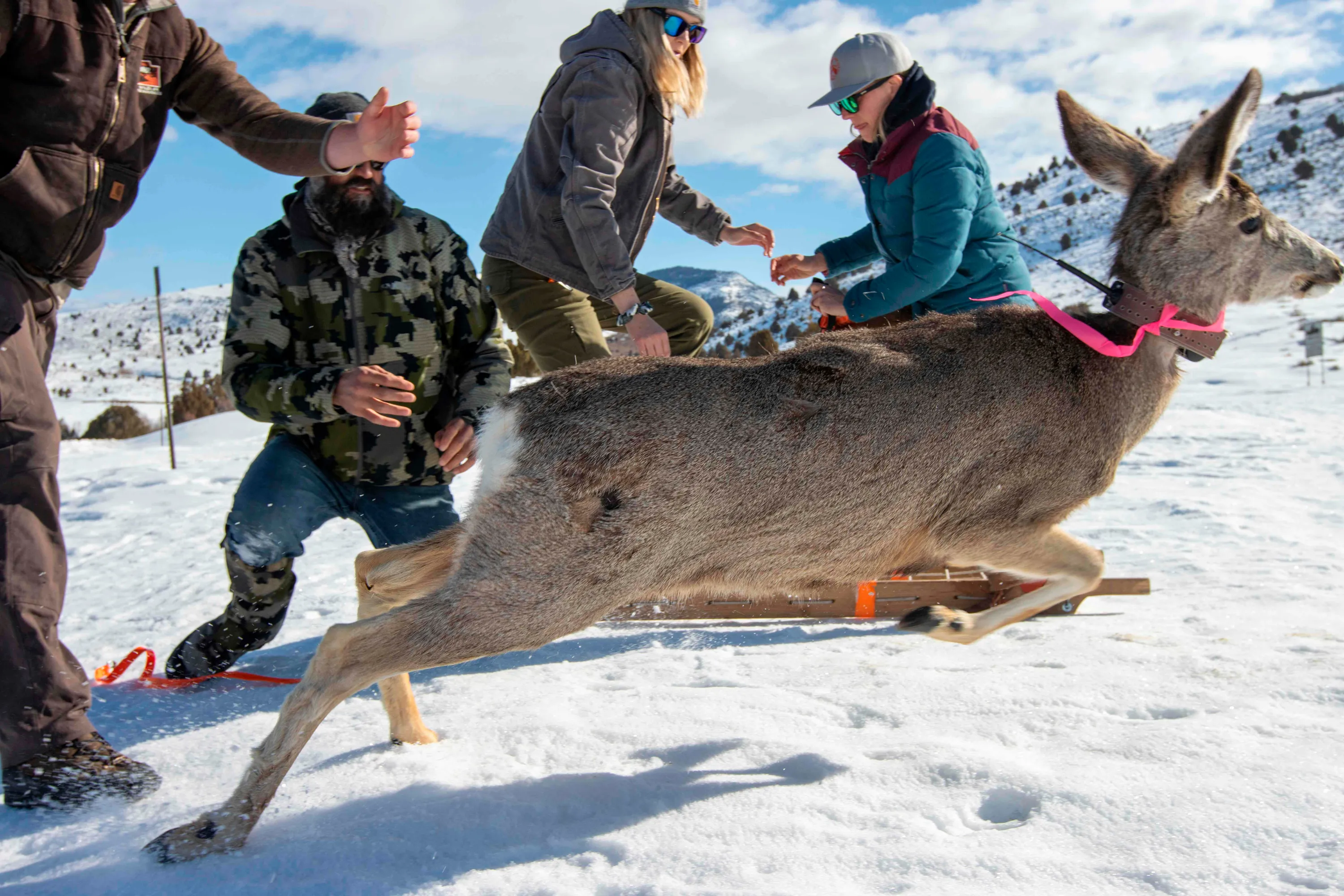 A mule deer is released by Division of Wildlife Resources employees after a health check at Hardware Ranch, near Hyrum Utah, on March 4, 2020. The staff collect data to come up with “body condition score”. They measure loin thickness, rump fat and physical size to arrive at an overall score of the percentage of body fat. These deer were captured and measured last fall, so the new data will reveal how well they did during winter, the most difficult time of the year. (Photo by Natalie Behring/AFP Photo)