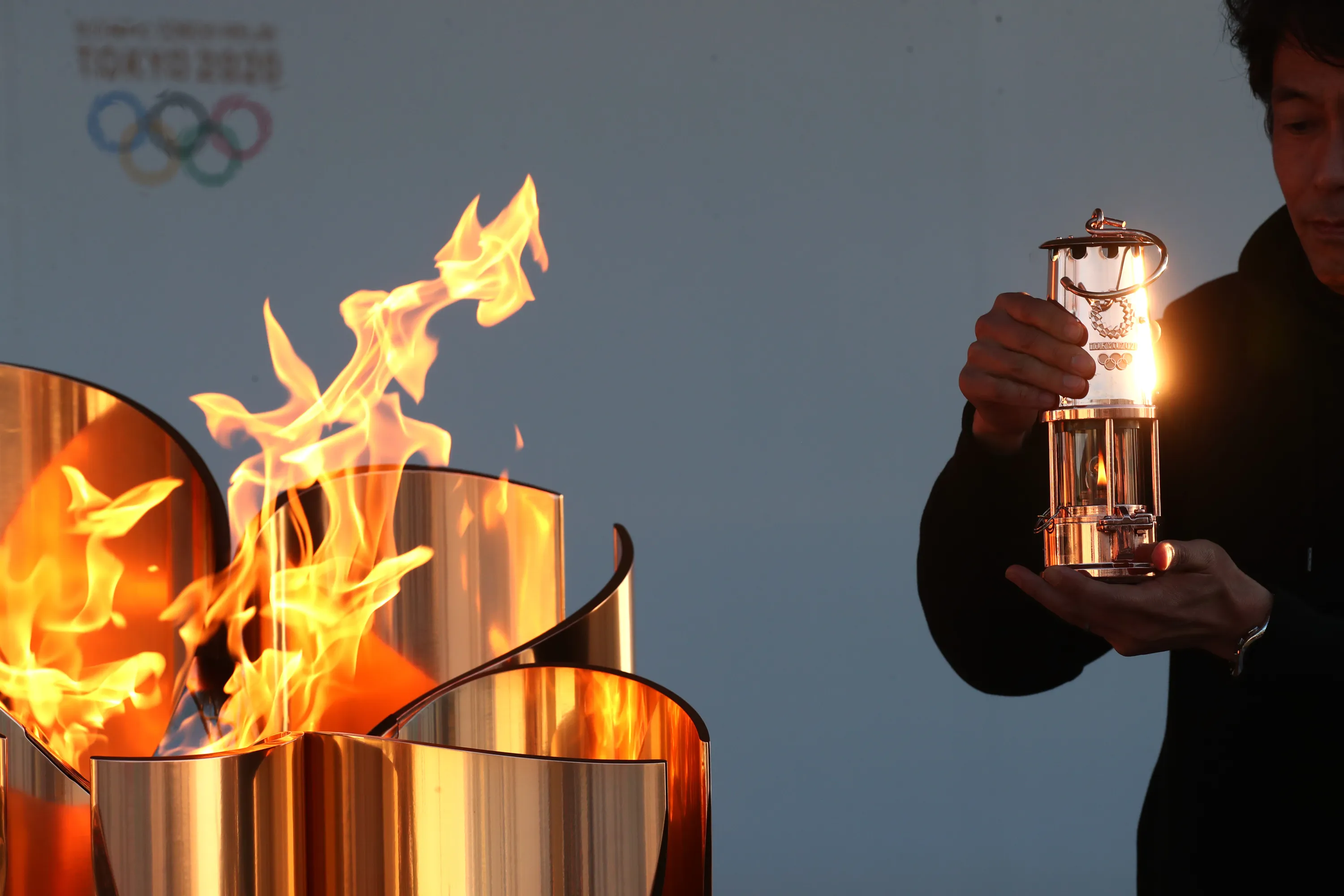 A staff preserves the Olympic flame to the lantern during the 'Flame of Recovery' special exhibition at Aquamarine Park a day after the postponement of the Tokyo 2020 Olympic and Paralympic Games announced due to the coronavirus pandemic on March 25, 2020 in Iwaki, Fukushima, Japan. (Photo by Clive Rose/Getty Images)