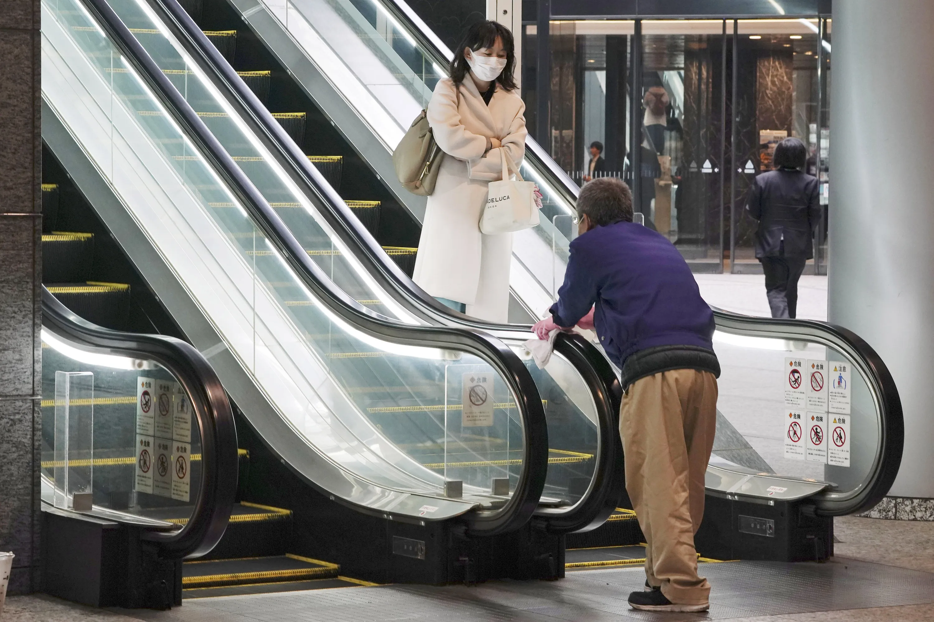 A woman wearing a mask as a precaution against a new coronavirus passes by a worker cleaning escalator handrails at a business building in Tokyo Monday, March 9, 2020. (Photo by Eugene Hoshiko/AP Photo)