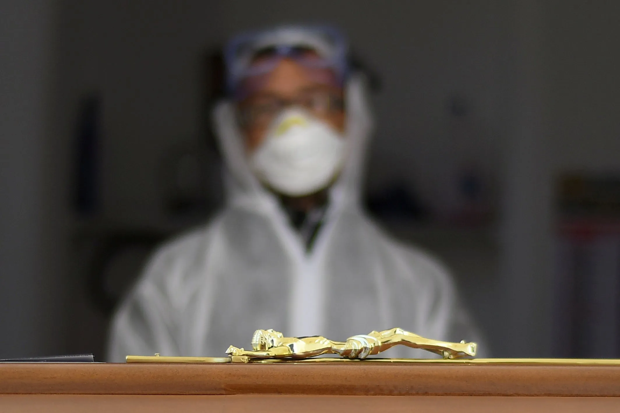 A funeral service worker looks at coffins of two victims of coronavirus disease (COVID-19) during a burial ceremony in the southern town of Cisternino, Italy on March 30, 2020. (Photo by Alessandro Garofalo/Reuters)