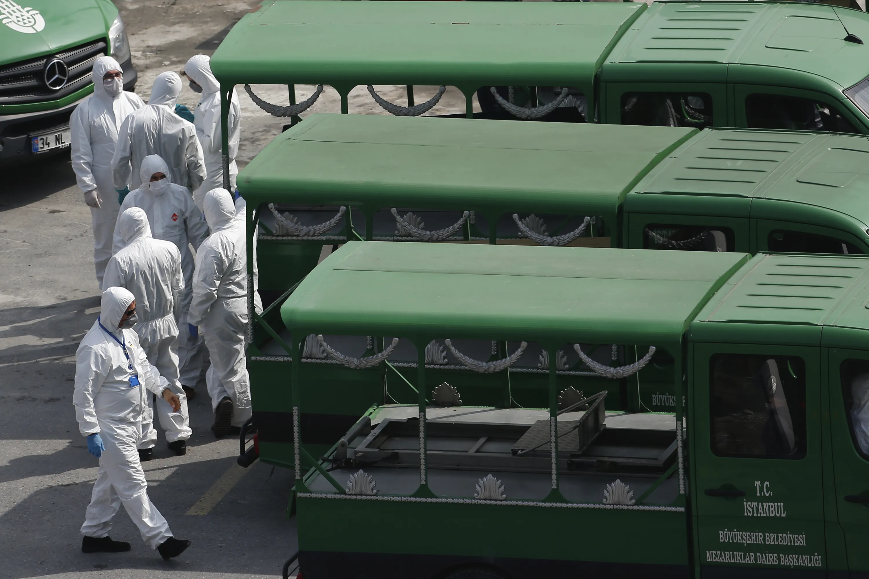 Officials wearing protective face masks and suits as a preventive measure against the spread of the coronavirus wait to load coffins of victims of Covid-19, to hearse trucks outside a morque in Istanbul, Monday, March 30, 2020. (Photo by Emrah Gurel/AP Photo)
