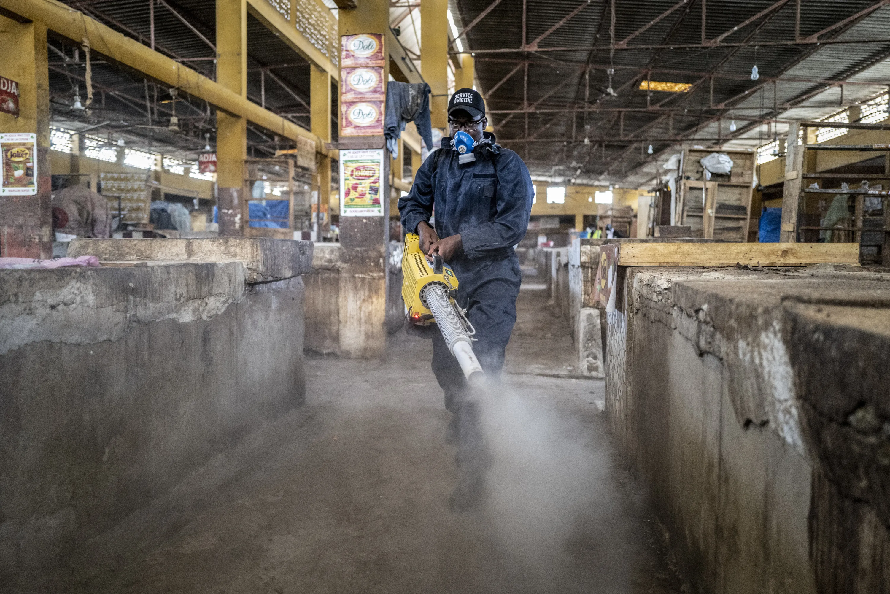 A municipal worker sprays disinfectant in the Grand Market of Dakar, Senegal in an attempt to halt the spread of the new coronavirus Monday, March 30, 2020. (Photo by Sylvain Cherkaoui/AP Photo)