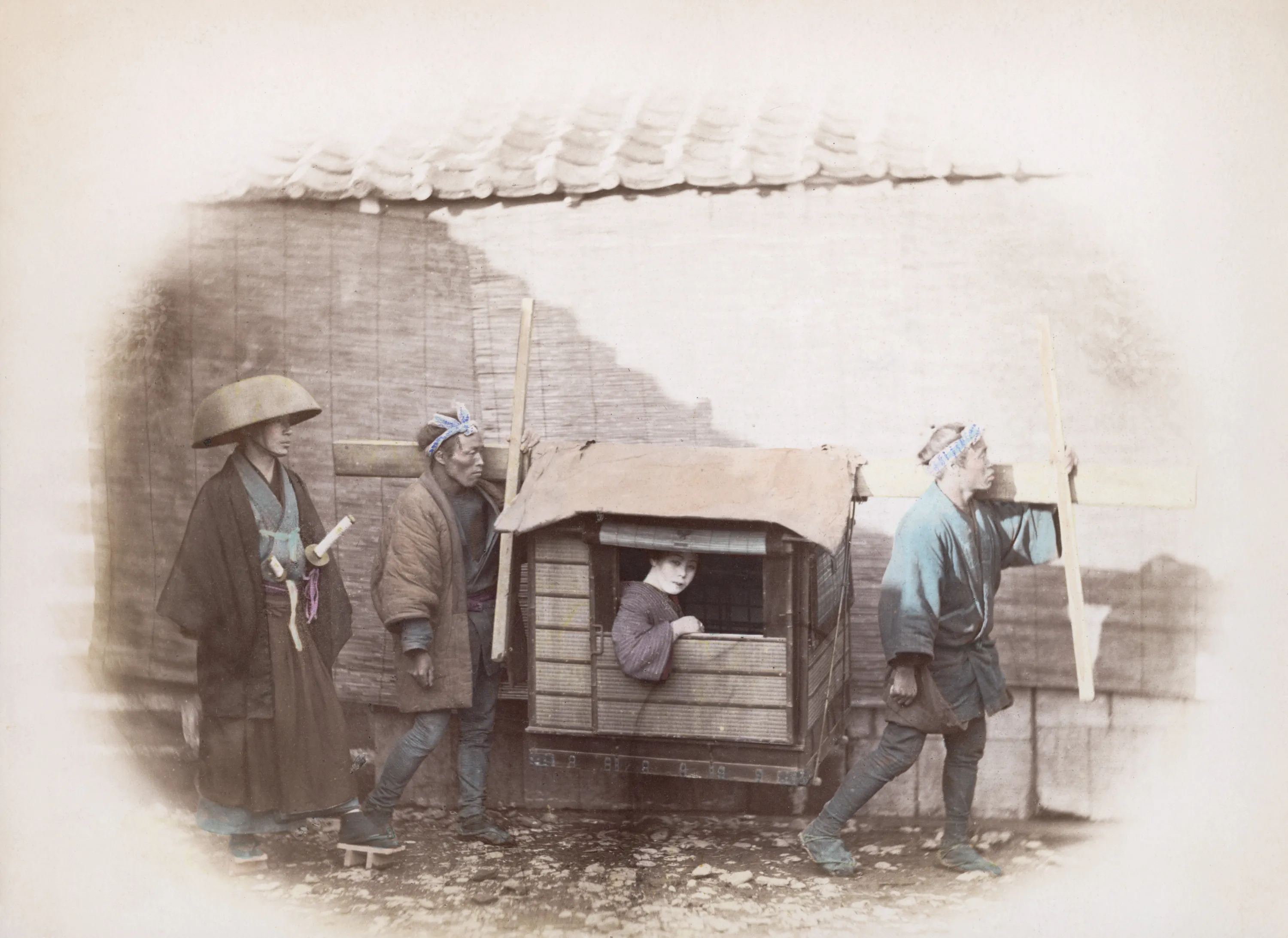 Two Japanese kago bearers carrying a woman in a sedan chair, circa 1865. A samurai with two swords accompanies the group. (Photo by Felice Beato/Spencer Arnold)