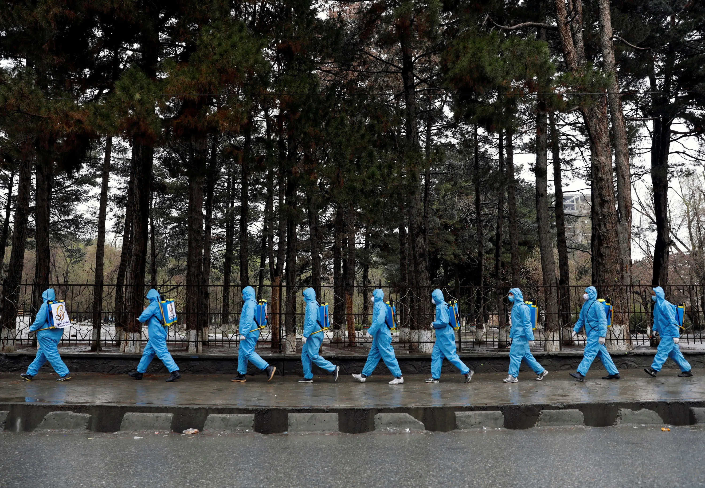 Volunteers prepare themselves to spray disinfectants on streets and shops amid concerns about coronavirus disease (COVID-19) in Kabul, Afghanistan on March 30, 2020. (Photo by Mohammad Ismail/Reuters)