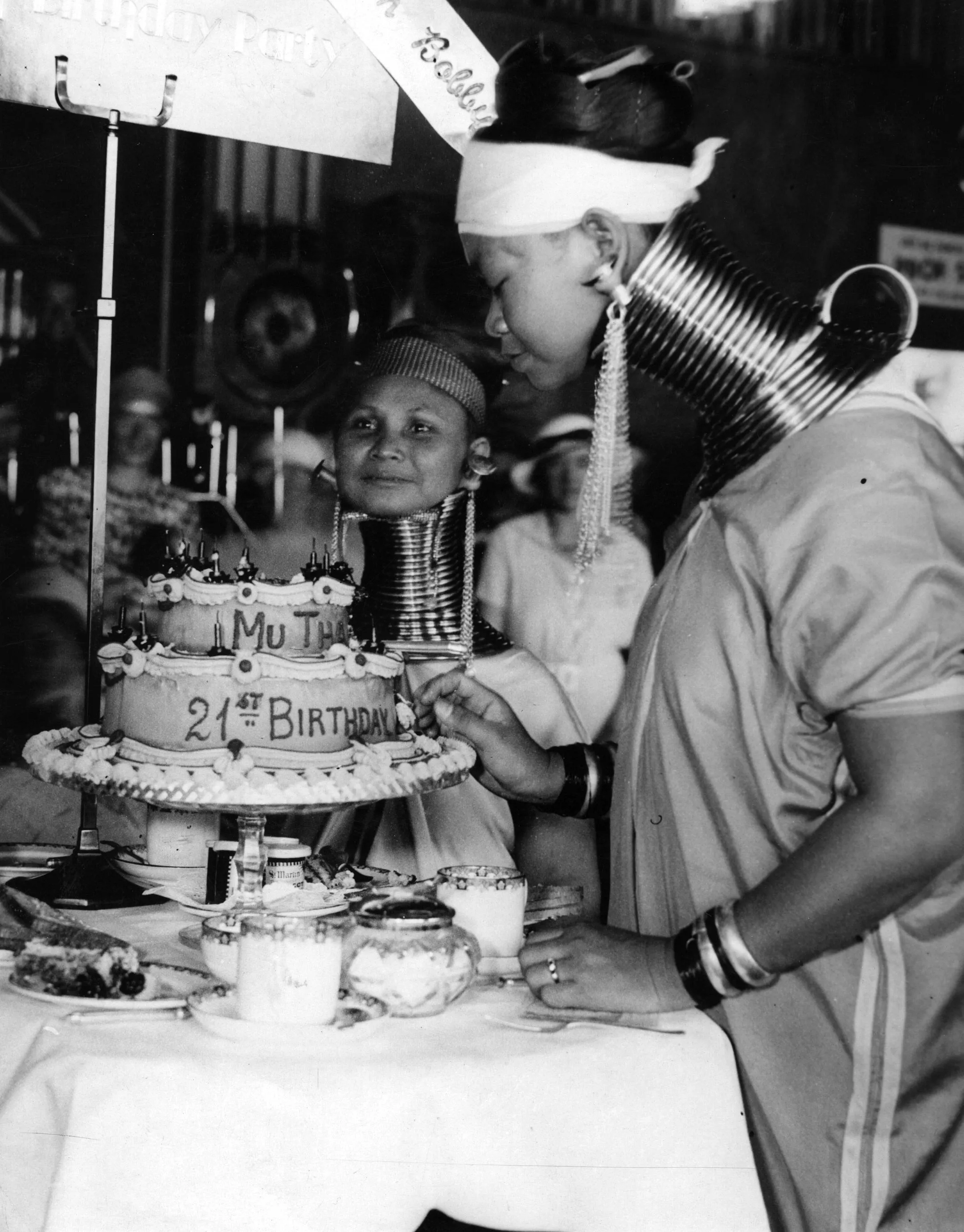 A Burmese woman, with traditional neck-extending rings, celebrates her twenty-first birthday with a cake in Folkestone with her friend. They are both part of Bertram Mills Circus, where they are billed as the “giraffe-necked Burmese ladies”. 25th August 1936. (Photo by A. J. O'Brien)