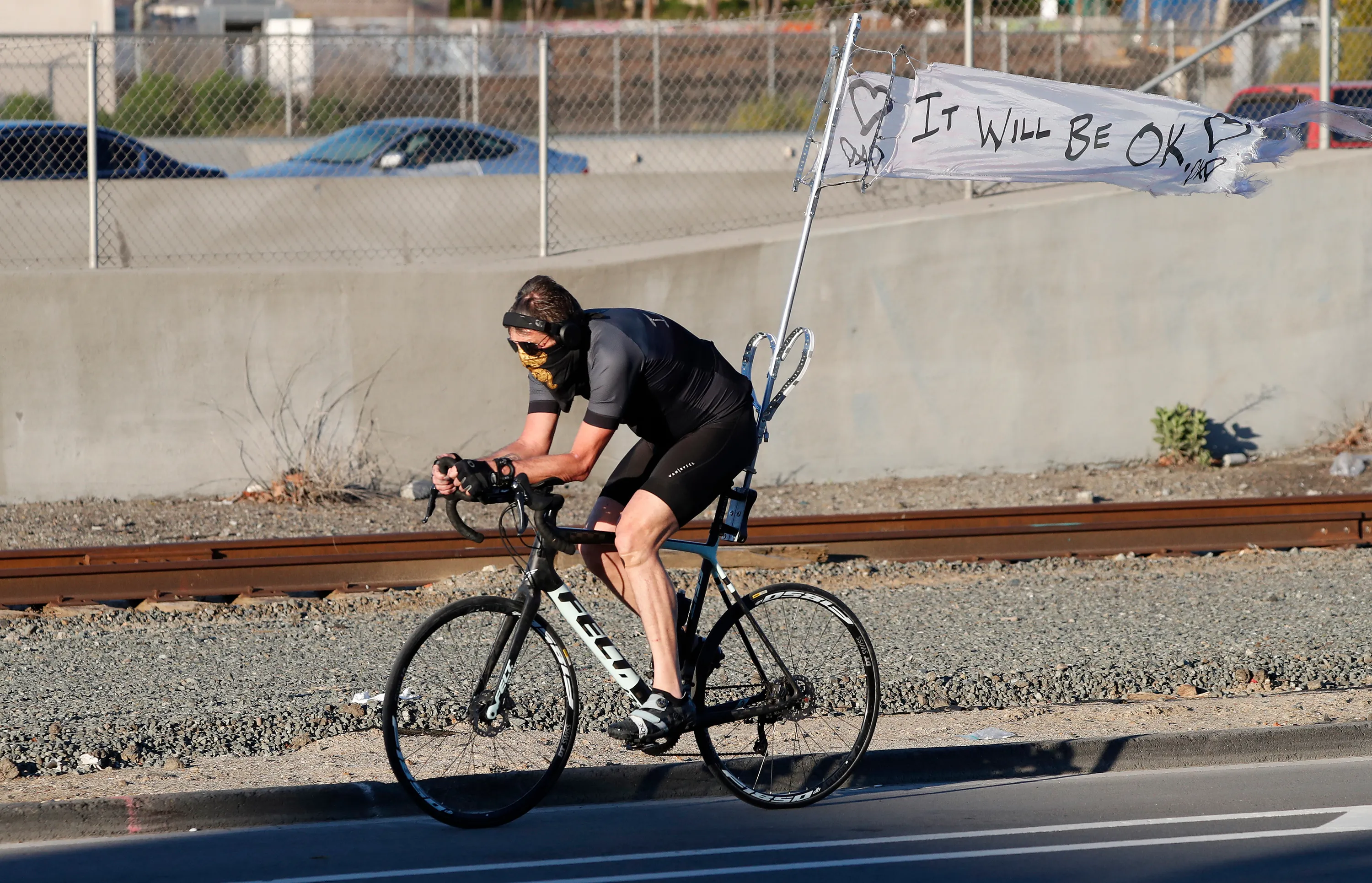 A banner reading “It Will Be Ok” waves from the bicycle of a man wearing a mask as he cycles through the streets of Oakland, California, USA, 30 March 2020. California Governor Gavin Newsom enforced a state-wide shelter-in-place legal order directing their residents to stay at home, except for essential work and essential needs such as grocery shopping, amid the ongoing coronavirus pandemic. (Photo by John G. Mabanglo/EPA/EFE)
