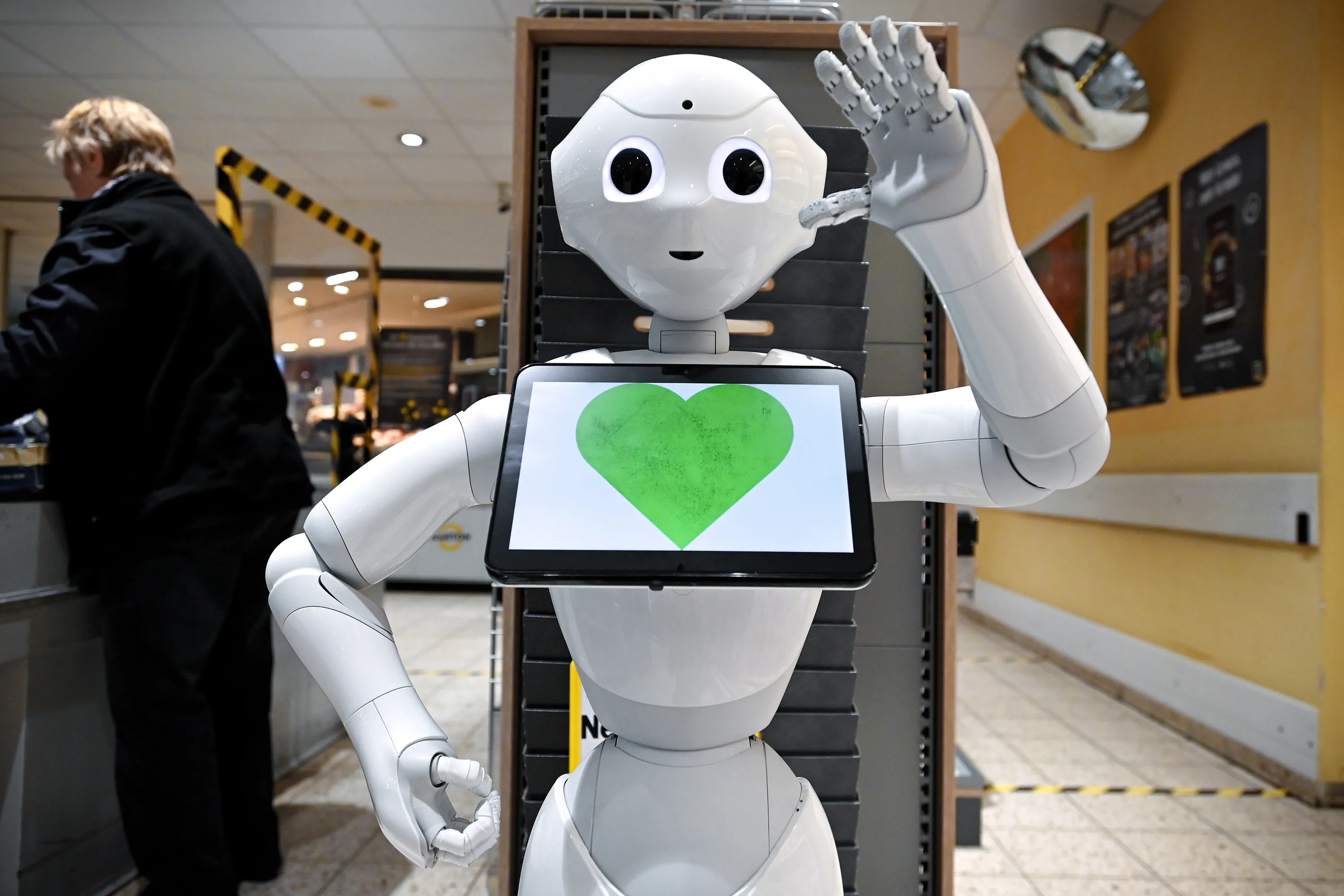 A humanoid robot named “Pepper” interacts with shoppers at a supermarket belonging to the Edeka chain, in Lindlar, western Germany, 31 March 2020. Pepper, who was actually developed as a robotic nurse, helps customers keep a safe distance between each other in order to minimize transmission of the SARS-CoV-2 coronavirus that causes the pandemic COVID-19 disease. According to the German federal disease control agency, the Robert Koch Institute, the number of COVID-19 cases in Germany has exceeded the 67,000 mark, while some 650 deaths have been recorded so far. (Photo by Sascha Steinbach/EPA/EFE)