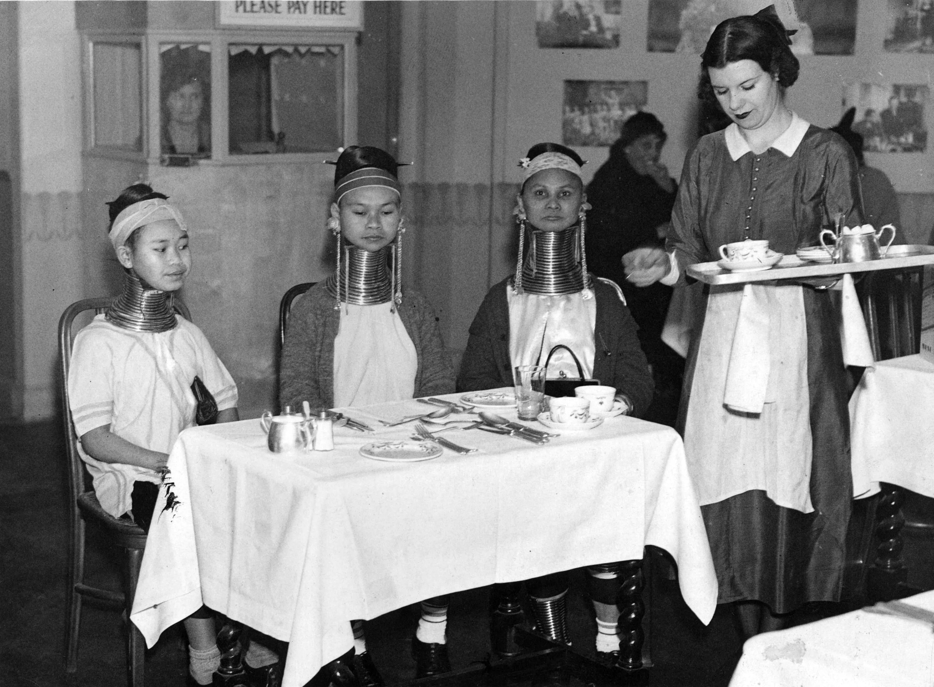 Giraffe necked women of Burma having tea in England, circa 1935. (Photo by General Photographic Agency)