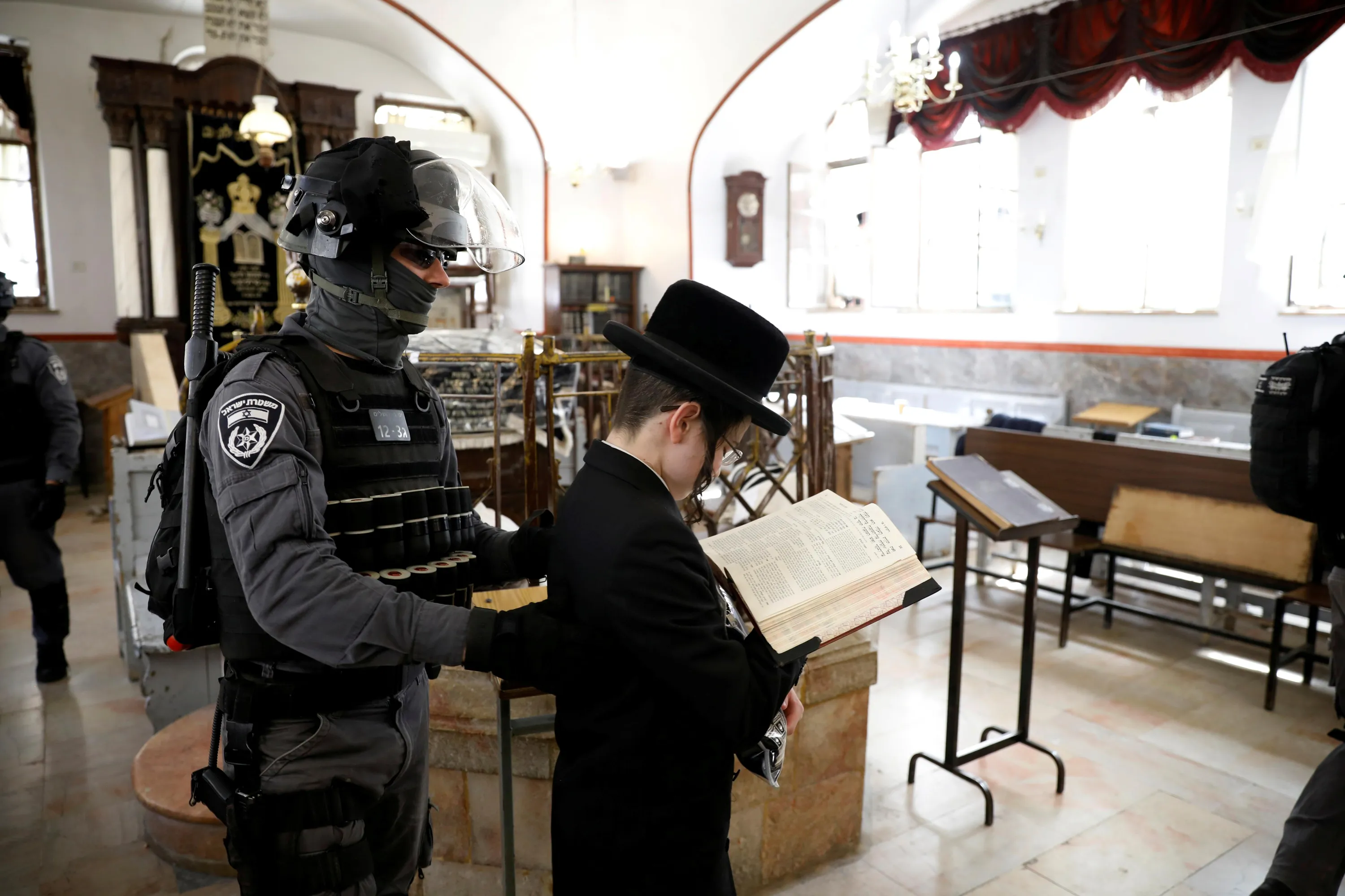 An Israeli policeman removes an ultra-Orthodox Jewish youth from a synagogue before it is closed by police as they enforce restrictions of a partial lockdown against the coronavirus disease (COVID-19) in Mea Shearim neighbourhood of Jerusalem on March 30, 2020. (Photo by Ronen Zvulun/Reuters)