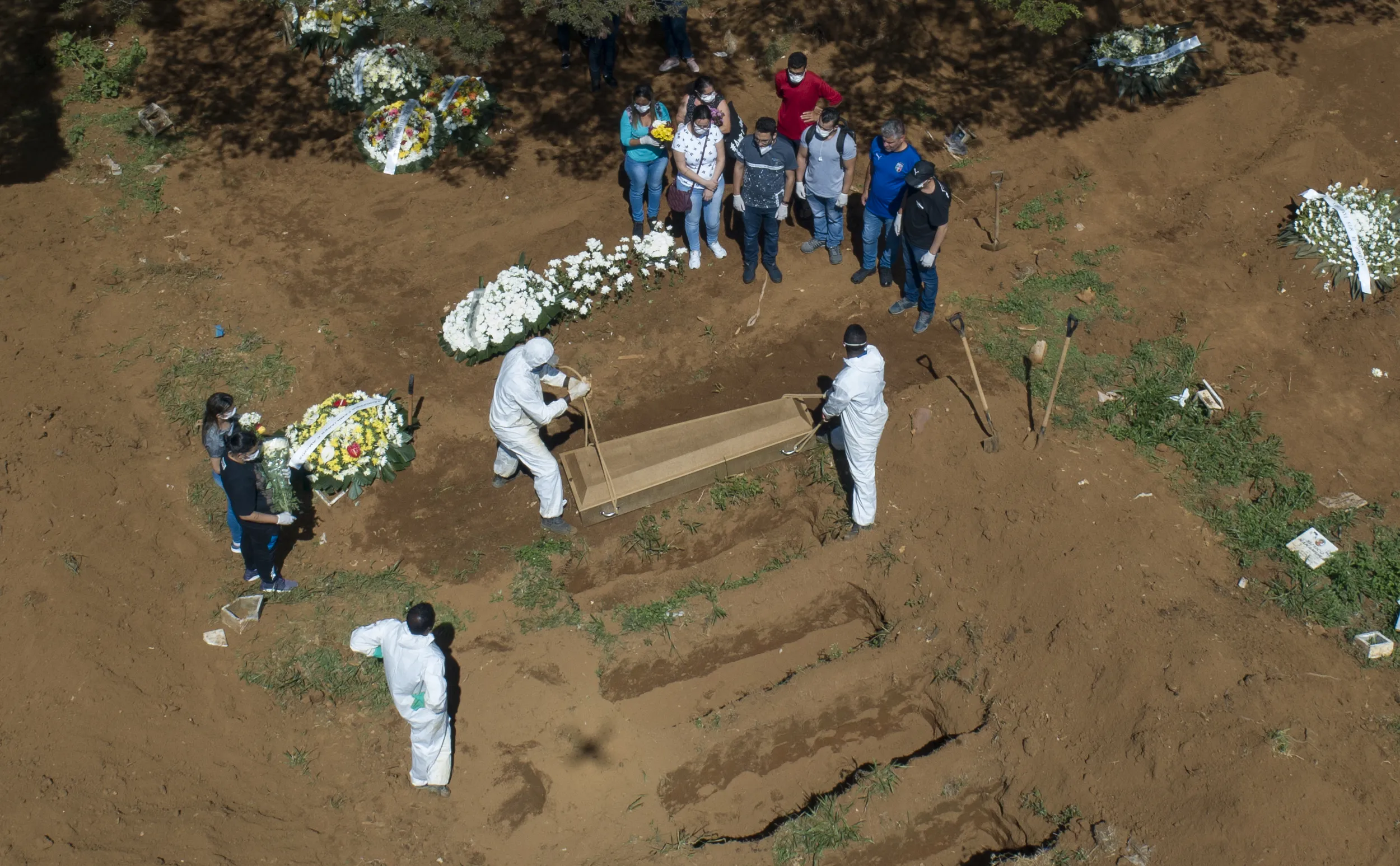 Cemetery workers bury a person at the Vila Formosa cemetery in Sao Paulo, Brazil, Wednesday, April 1, 2020. Vila Formosa cemetery, the largest in Latin America, has had a 30 percent increase in the number of burials after the start of the spread of the new coronavirus, according to the cemetery's administration. (Photo by Andre Penner/AP Photo)
