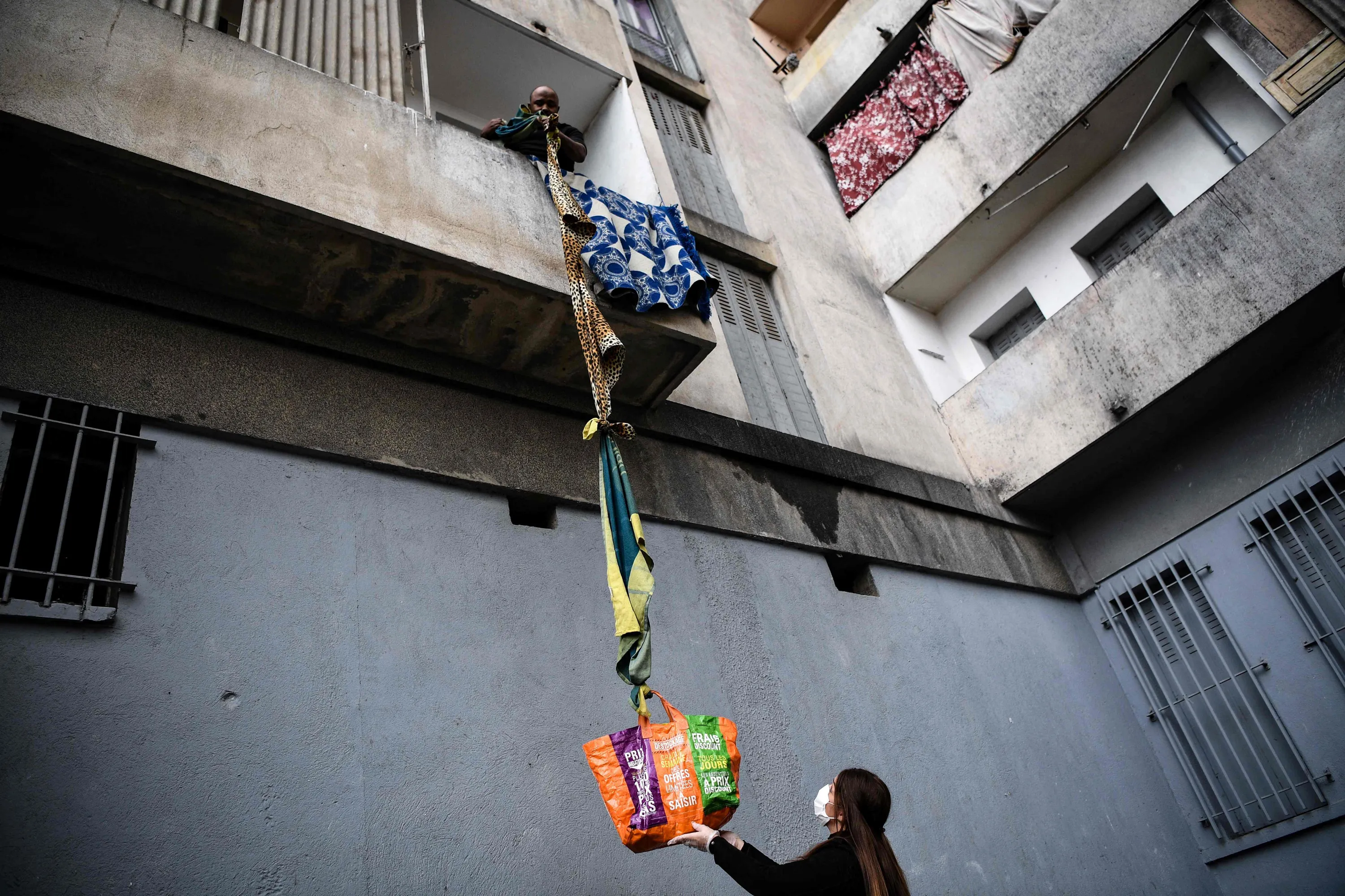 A resident of the White House estate, a private condominium of 226 mostly unsanitary dwellings, collects food offered by neighbours from his balcony, using a rope made with blankets, on March 31, 2020, in Marseille, southern France, on the fifteenth day of a lockdown aimed at curbing the spread of the COVID-19 (novel coronavirus). (Photo by Anne-Christine Poujoulat/AFP Photo)