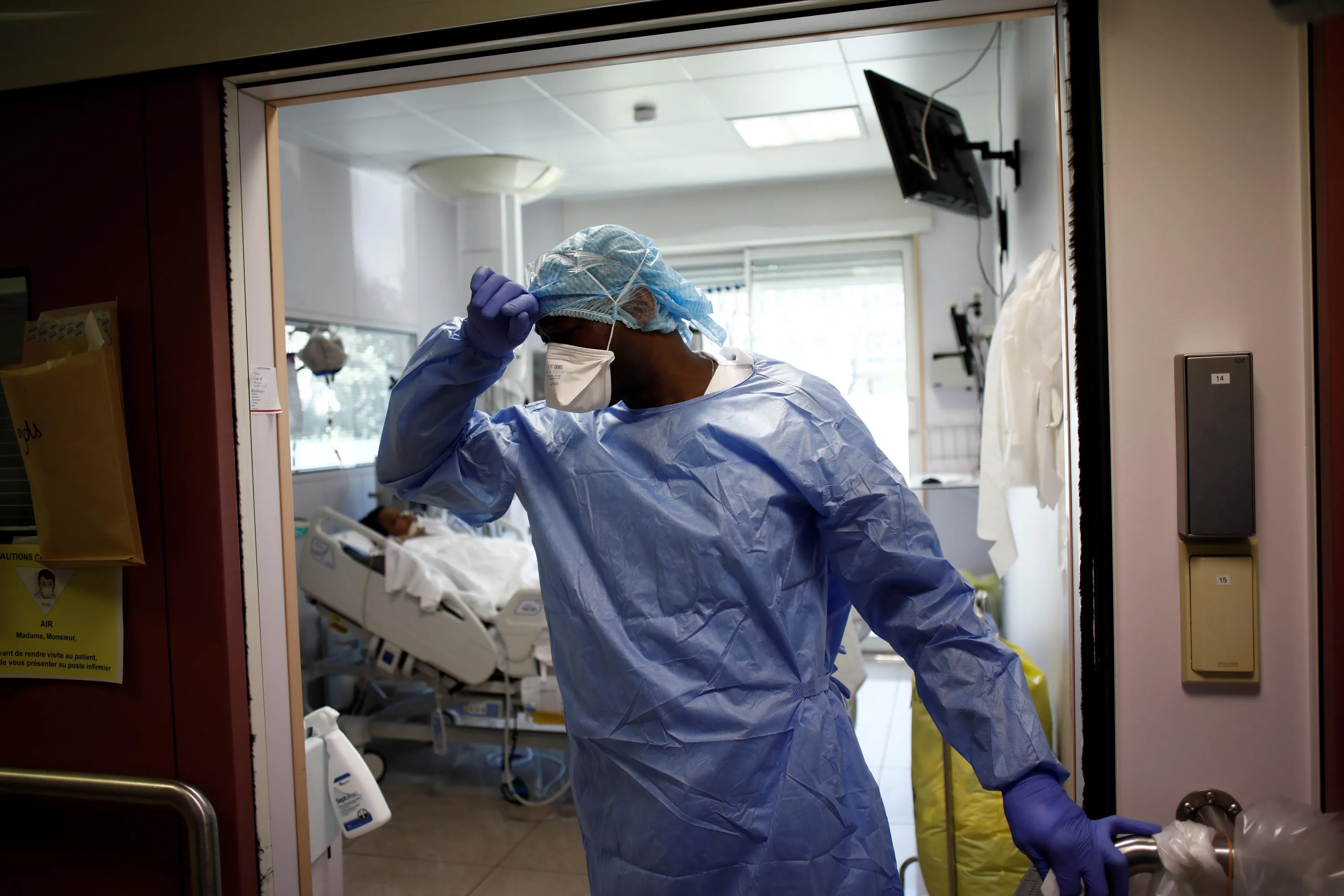 Medical staff, wearing protective suits and face masks, work at the intensive care unit for coronavirus disease (COVID-19) patients at Ambroise Pare clinic in Neuilly-sur-Seine near Paris, France, April 1, 2020. (Photo by Benoit Tessier/Reuters)