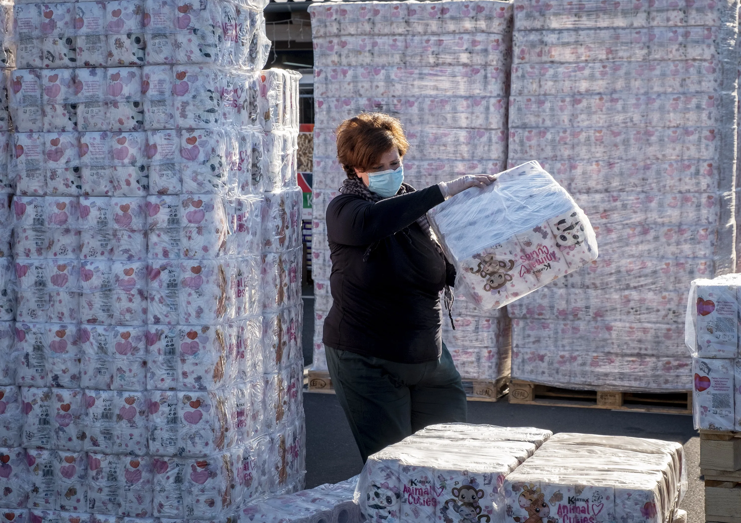 A woman piles up toilet paper at a a “toilet paper drive in” on a parking spot in Dornburg, some 60 km west of Frankfurt, Germany, Wednesday, April 1, 2020. After panic buying due to the coronavirus outbreak toilet paper has become rare and the owner of a pet food shop was able to order thousands of rolls of toilet paper which he sells now outside of his shop. (Photo by Michael Probst/AP Photo)