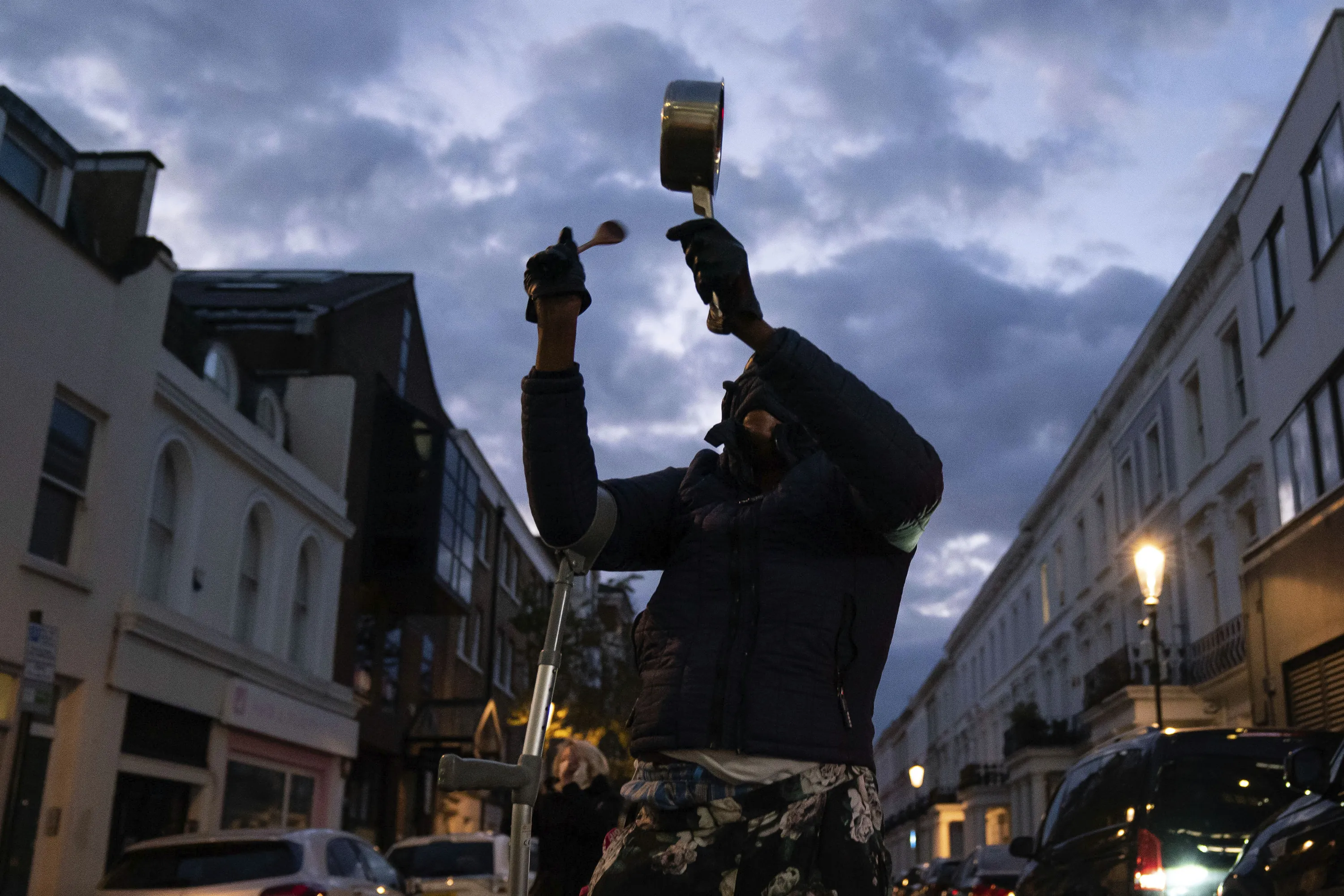 A member of the public bangs a pot outside the Chelsea and Westminster Hospital to salute local heroes during Thursday's nationwide Clap for Carers NHS initiative to applaud workers fighting the coronavirus pandemic, in London, Thursday, April 2, 2020. (Photo by Aaron Chown/PA Wire via AP Photo)