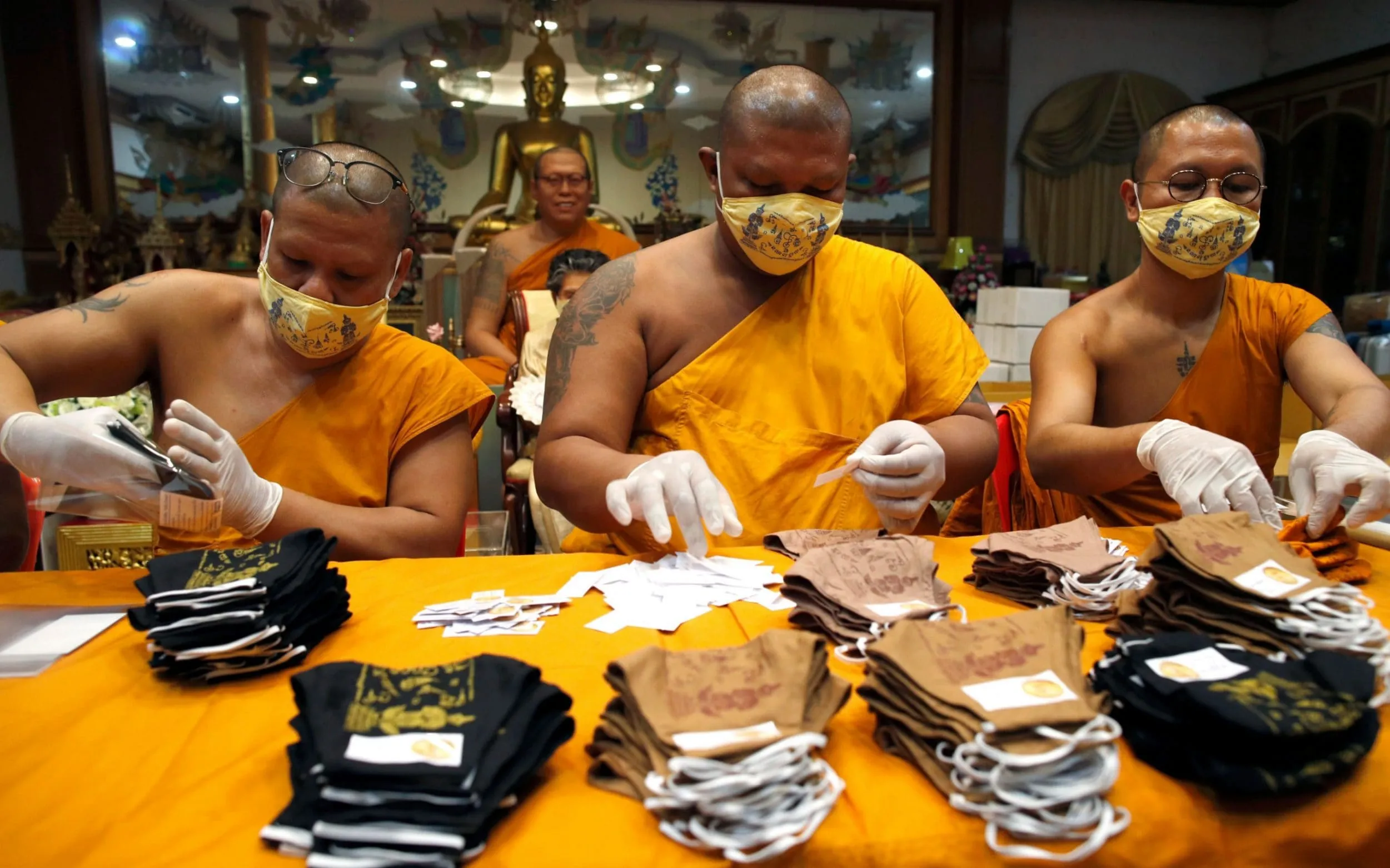 Thai Buddhist monks pack face masks inscribed with spiritual incantations at Wat Phai Lom in Nakhon Pathom province, Thailand, 29 March 2020. The face masks made by villagers are inscribed with spiritual incantations by Thai Buddhist monk Phra Kru Palad Sitthiwat, known as Luang Phi Namfon, the abbot of Wat Phai Lom, and sold by him, aimed to protect devotees from the growing fear of people in the wake of the coronavirus COVID-19 pandemic. More than 100,000 of the talisman protective masks have been sold across Thailand. Seven people have died in the country since the beginning of the coronavirus outbreak, and more than 1,300 COVID-19 infections have been reported so far. (Photo by Rungroj Yongrit/EPA/EFE)