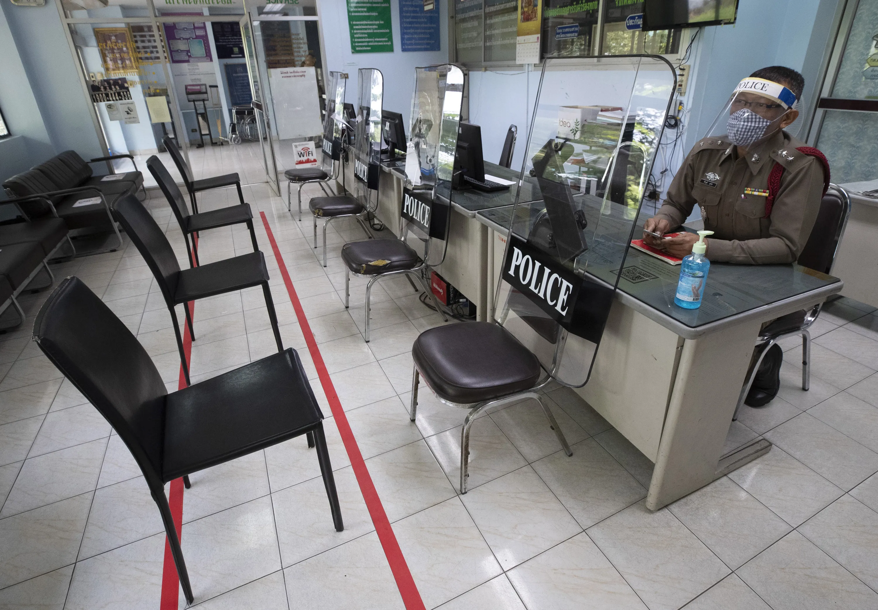 Police use riot shields to practice social distancing to help curb the spread of the coronavirus at the Tha Phra police station on Monday, March 30, 2020. (Photo by Sakchai Lalit/AP Photo)