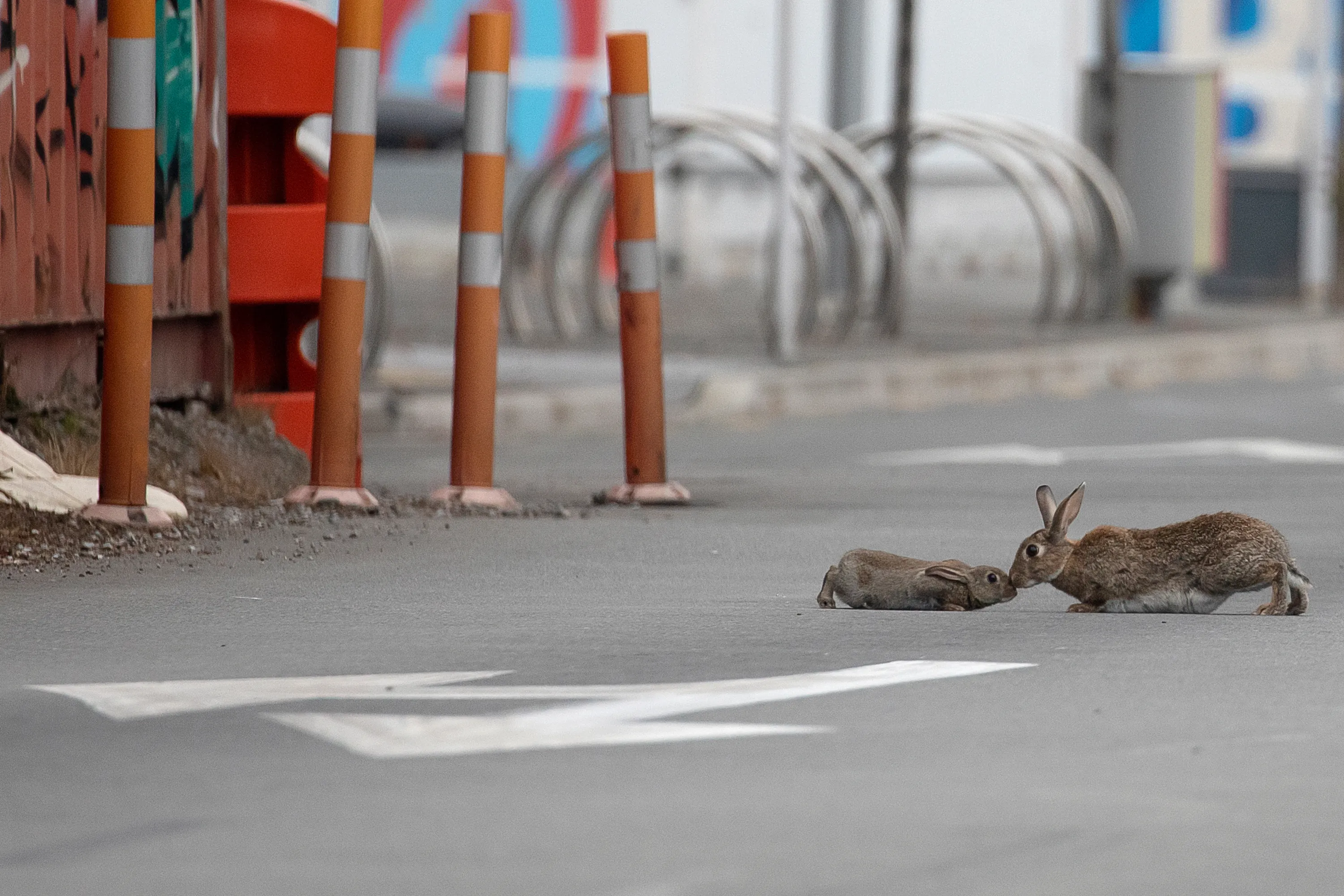 A baby rabbit and its mother leveret sharing an intimate moment middle of a main road which is empty of traffic in Christchurch, New Zealand, on April 01, 2020. New Zealand has been lockdown for four weeks in an attempt to minimize the spread of the Covid-19 virus since the 25th of March. There are currently 708 cases of COVID-19 in New Zealand and one person died as a result of the virus. (Photo by Sanka Vidanagama/NurPhoto via Getty Images)