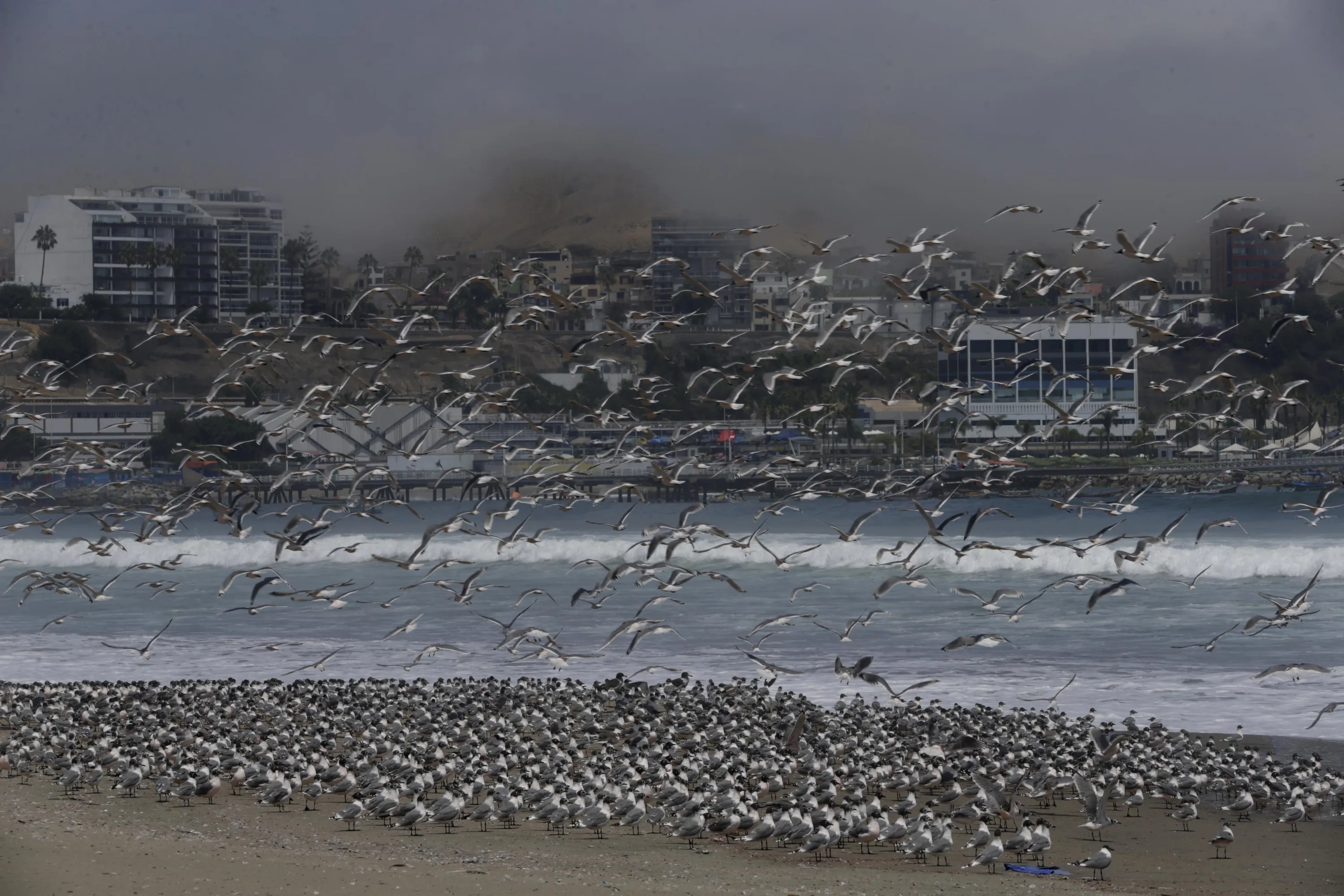 Hundred of birds overtake Agua Dulce beach which is usually populated with people, in Lima, Peru, Tuesday, March 24, 2020. Peru is in its second week of a government decreed state of emergency, after President Martin Vizcarra ordered residents to stay in their homes in an effort to contain the spread of the new coronavirus. (Photo by Martin Mejia/AP Photo)
