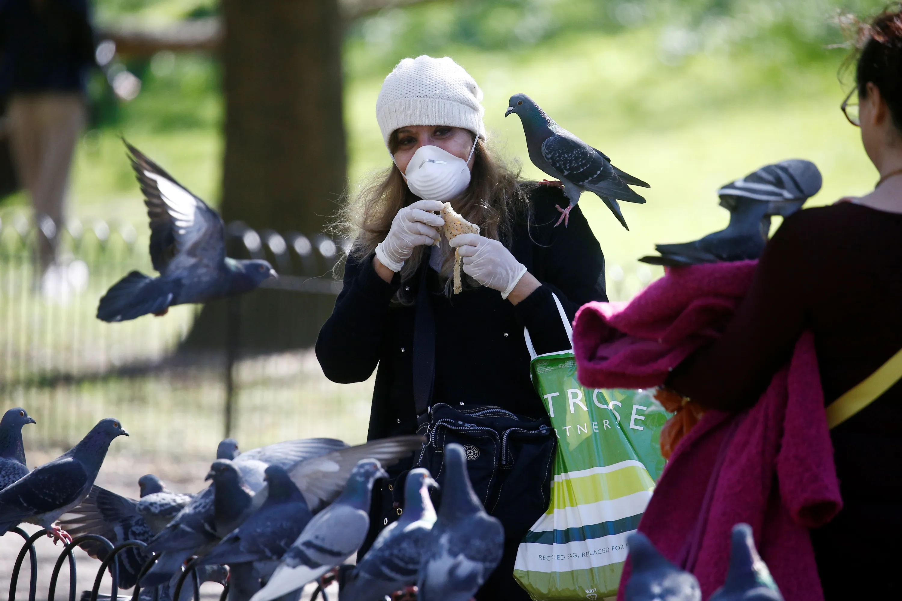 A lady wearing a mask feeds pigeons in St James' Park, as the spread of the coronavirus disease (COVID-19) continues, London, Britain, April 5, 2020. (Photo by Henry Nicholls/Reuters)
