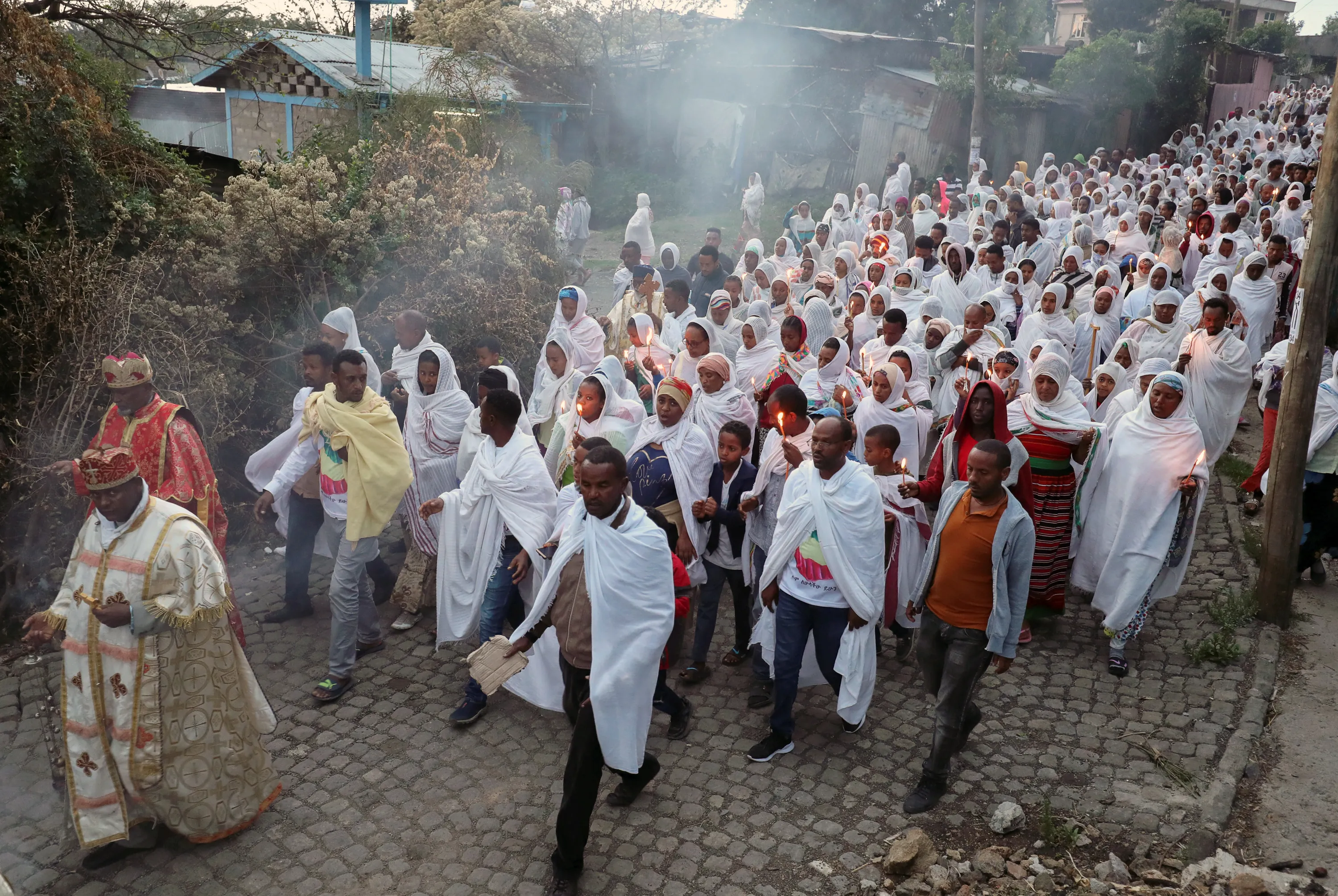 Ethiopian Orthodox faithful hold candles as they receive a blessing from a priest with an incense smoke which according to their belief will keep the coronavirus disease (COVID-19) away, in Addis Ababa, Ethiopia on March 26, 2020. (Photo by Tiksa Negeri/Reuters)