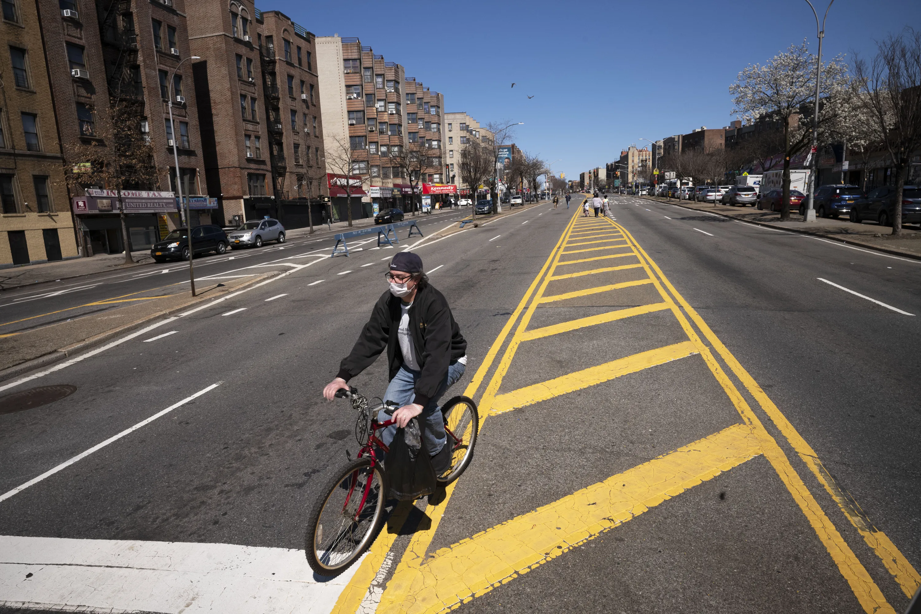 A man wearing a mask bicycles along a section of the Grand Concourse that has been temporarily closed to vehicular traffic as the city tests out a pilot program providing more social distancing space during the coronavirus pandemic, Friday, March 27, 2020 in the Bronx borough of New York. (Photo by Mark Lennihan/AP Photo)