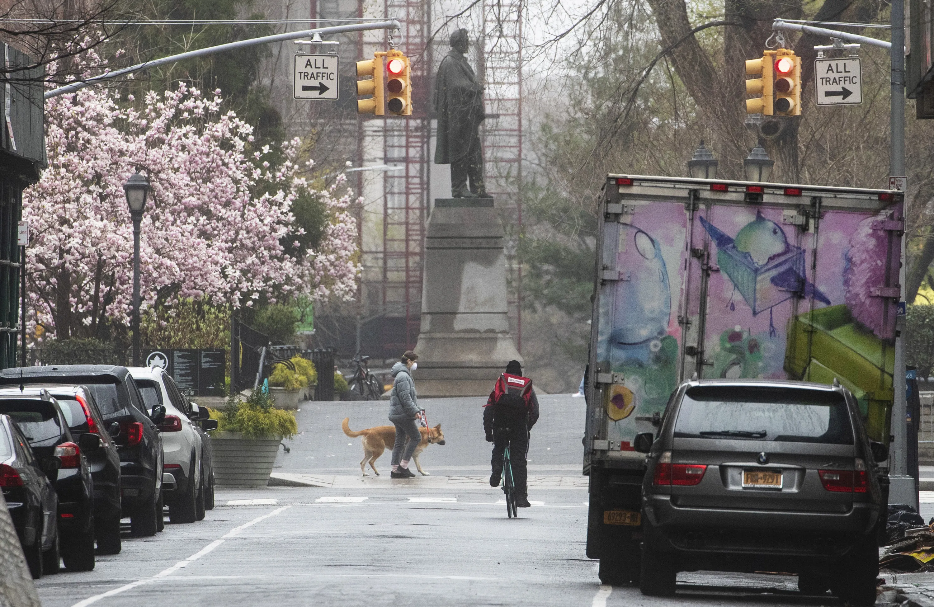A cyclist and a dog walker are seen along West 16th Street near Union Square, Sunday, March 29, 2020, in New York. (Photo by Mary Altaffer/AP Photo)