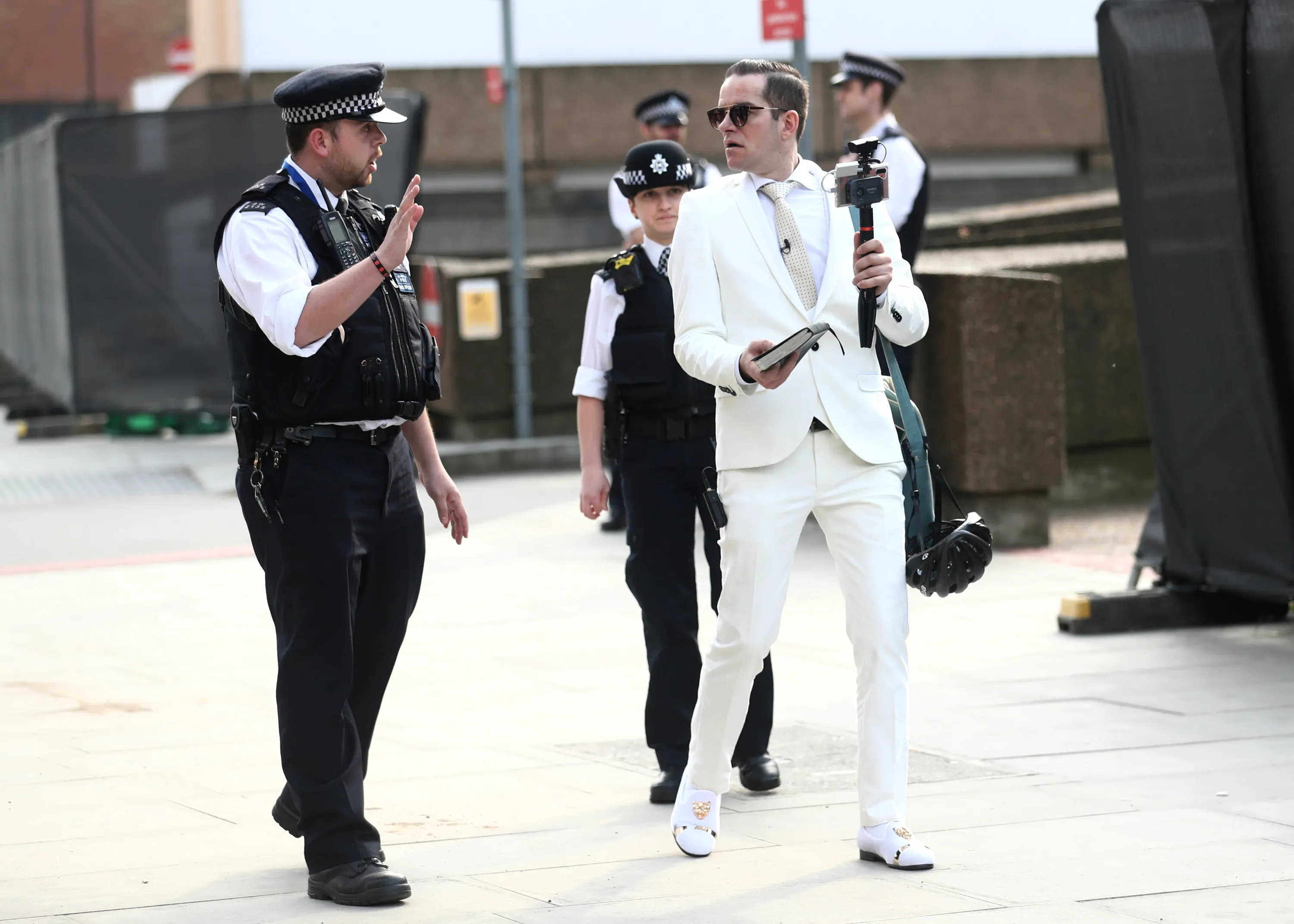 Police officers speak with a man who was preaching outside St Thomas' hospital as the spread of the coronavirus disease (COVID-19) continues, London, Britain, April 8, 2020. (Photo by Simon Dawson/Reuters)