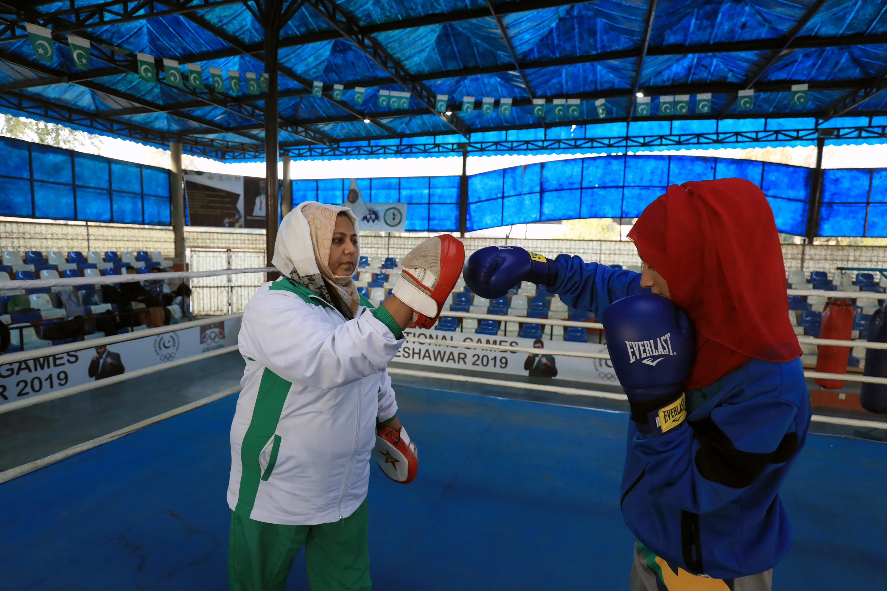 Shahnaz Kamal Khan (L) coaches a student during a training session at the stadium in Peshawar, Pakistan December 20, 2019. Kamal is the first and only international female boxing coach registered with the boxing federation of Pakistan, in a male-dominated sport and a conservative country. That hasn't stopped the Peshawar-born woman from making her mark – she's doing her best to nurture a younger generation of boxers. (Photo by Fayaz Aziz/Reuters)