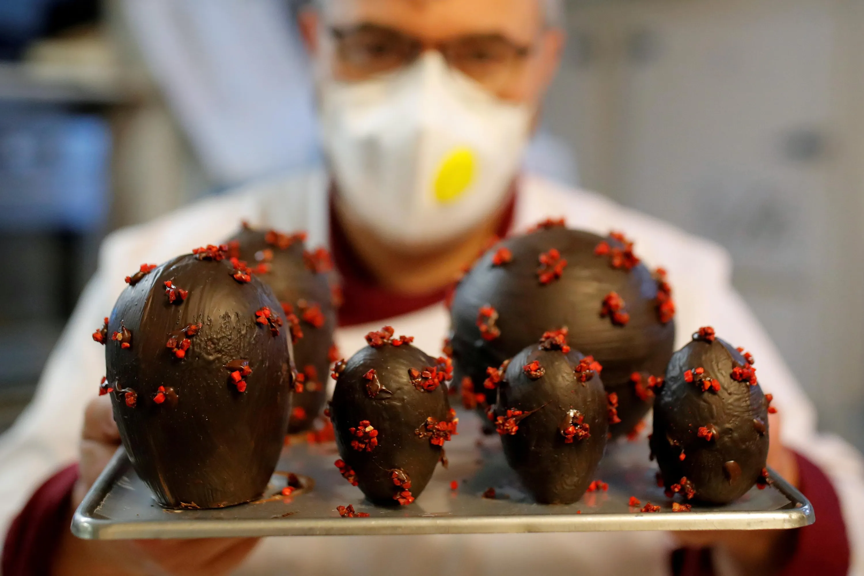 French chocolate maker Jean-Francois Pre displays Easter eggs shaped as coronavirus in his pastry shop ahead of Easter celebrations in Landivisiau, as the spread of the coronavirus disease (COVID-19) continues in France, April 8, 2020. (Photo by Stephane Mahe/Reuters)