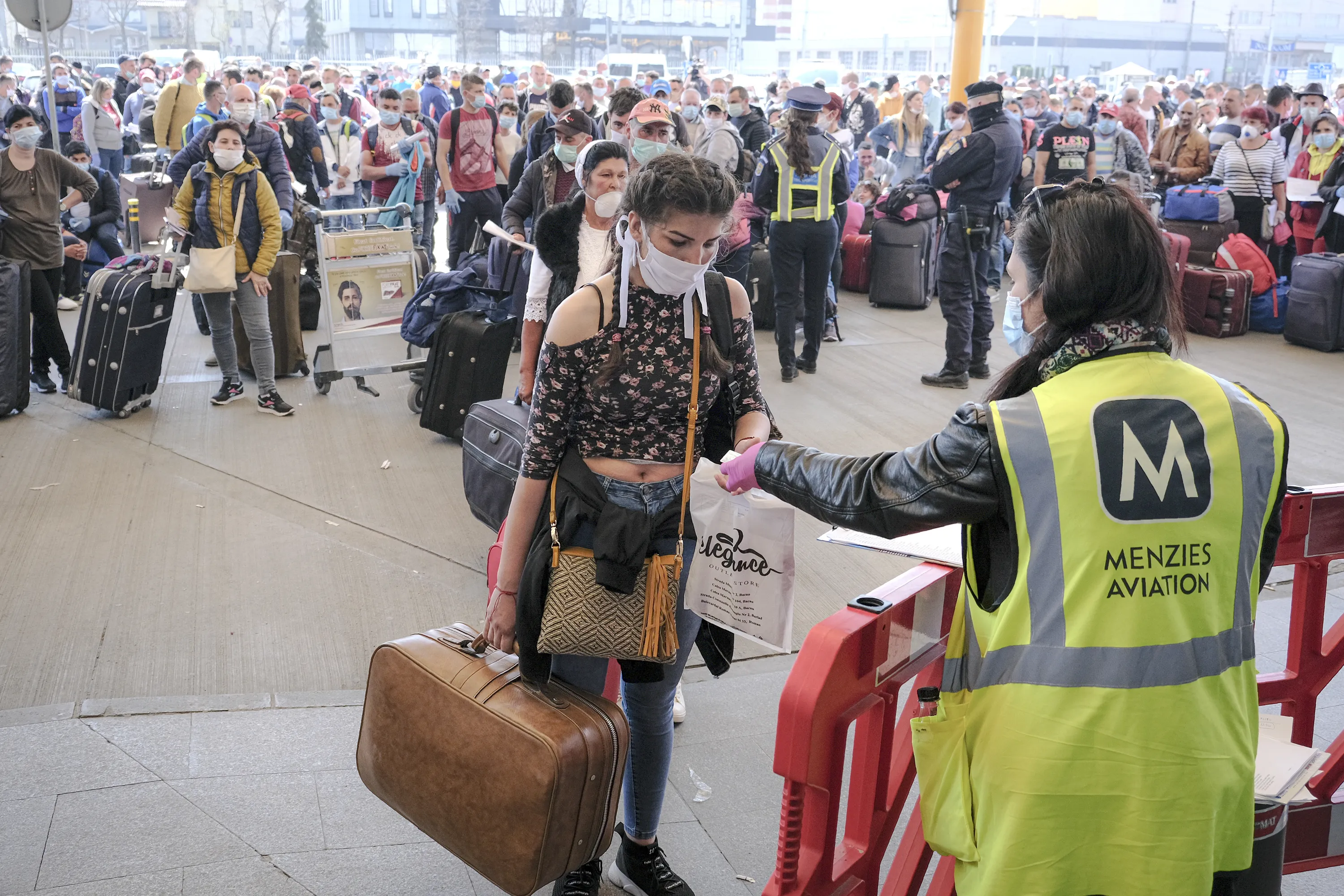 Romanian seasonal workers wait outside the Avram Iancu international airport, in Cluj, central Romania, Thursday, April 9, 2020. More then 1800 workers from across Romania are traveling on 12 flights to Berlin, Baden Bade and Dusseldorf in Germany, most of them to work in asparagus farms. (Photo by Raul Stef/AP Photo)