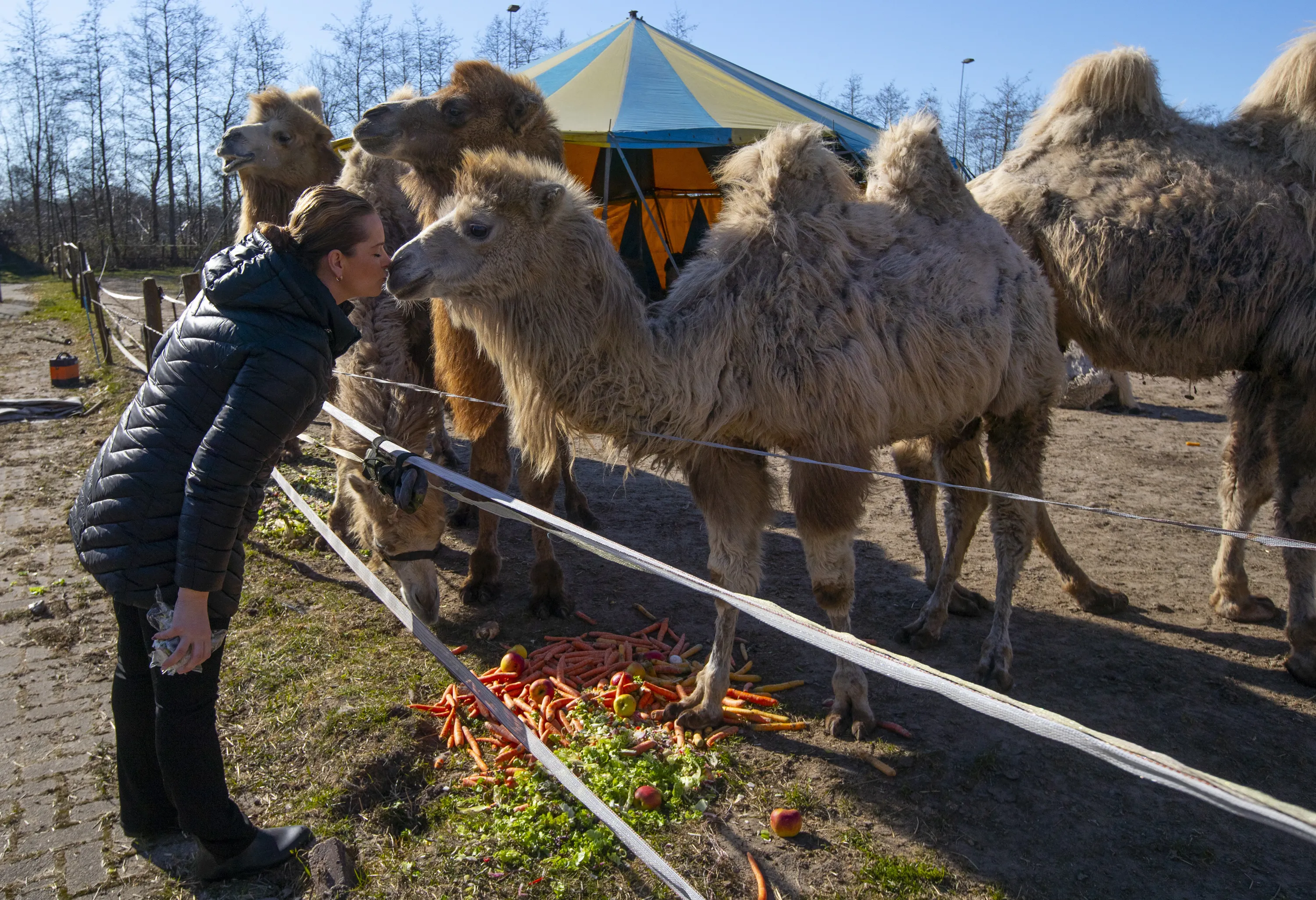 Sarina Renz kisses one of the eight Siberian Steppe camels, of the stranded Renz Circus in Drachten, northern Netherlands, Tuesday, March 31, 2020. The circus fleet of blue, red and yellow trucks have had a fresh lick of paint over the winter. But now, as coronavirus measures shut down the entertainment industry across Europe, they have no place to go. “It's catastrophic for everybody”, said Sarina Renz, of the German family circus that has been in existence since 1842. (Photo by Peter Dejong/AP Photo)