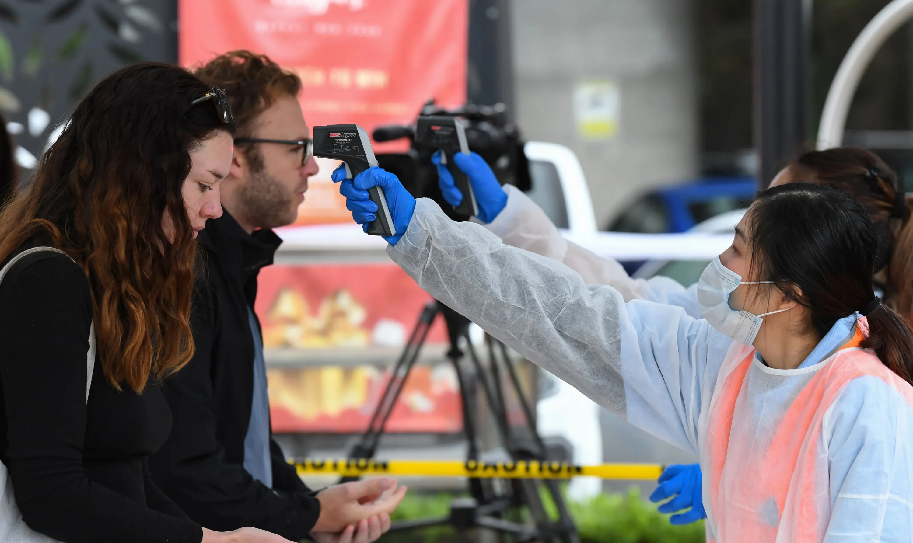 Visitors at Sydney Fish Market have their temperature checked before being allowed access on April 10, 2020 in Sydney, Australia. With strict social distancing rules in place due to COVID-19, the Sydney Fish Market has implemented new measures for Easter weekend including additional crowd control to limit how many people can be on site at one time will be in place. Public gatherings are now limited to two people, while Australians are being urged to stay home unless absolutely necessary in a bid to reduce the spread of COVID-19. New South Wales and Victoria have also enacted additional lockdown measures to allow police the power to fine people who breach the two-person outdoor gathering limit or leave their homes without a reasonable excuse, such as grocery shopping, medical purposes, for exercise, or to go to work. (Photo by James D. Morgan/Getty Images)
