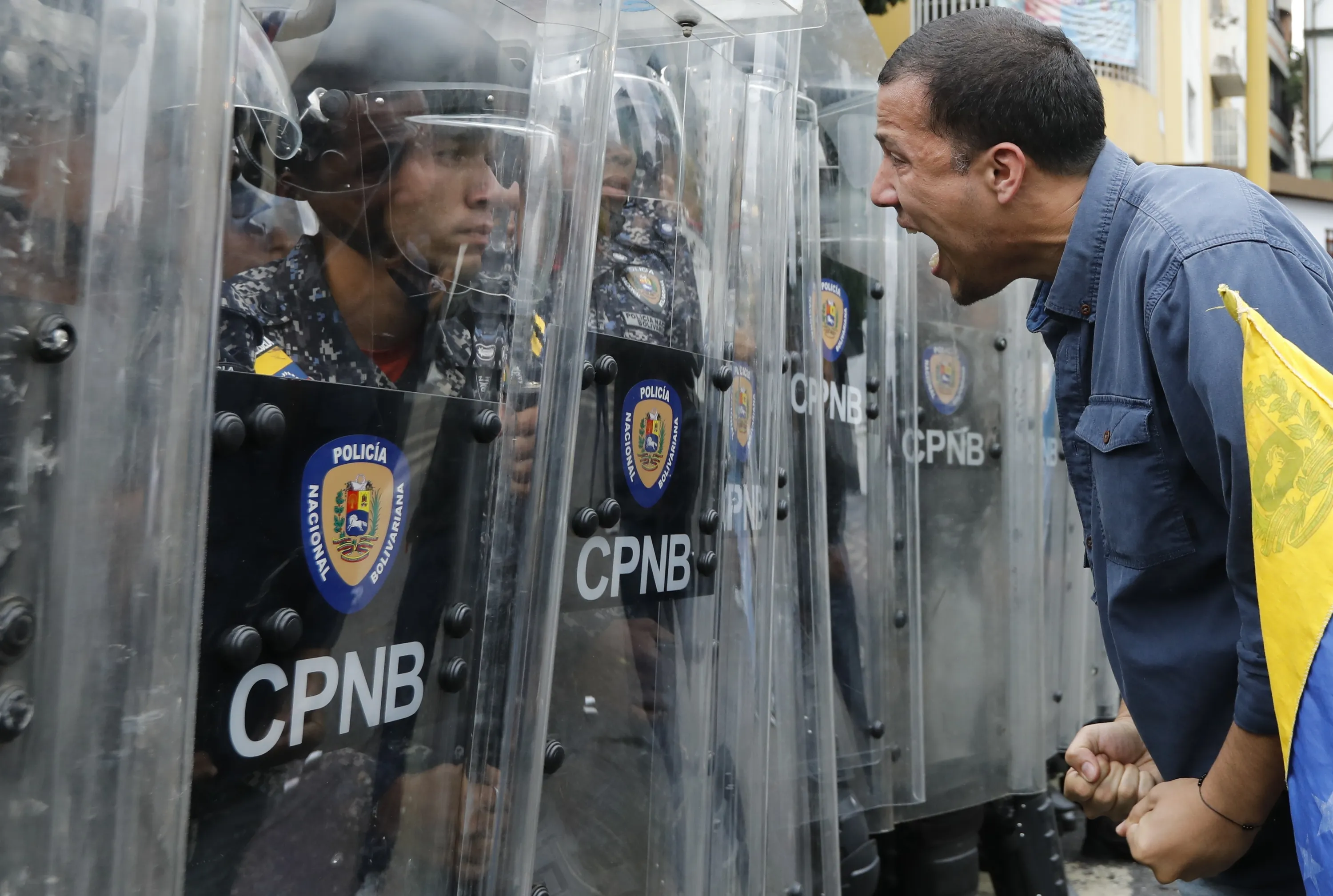 A protester yells at police blocking an opposition march in Caracas, Venezuela, Tuesday, March 10, 2020. U.S.-backed Venezuelan political leader Juan Guaido is leading a march aimed at retaking the National Assembly legislative building, which opposition lawmakers have been blocked from entering. (Photo by Ariana Cubillos/AP Photo)