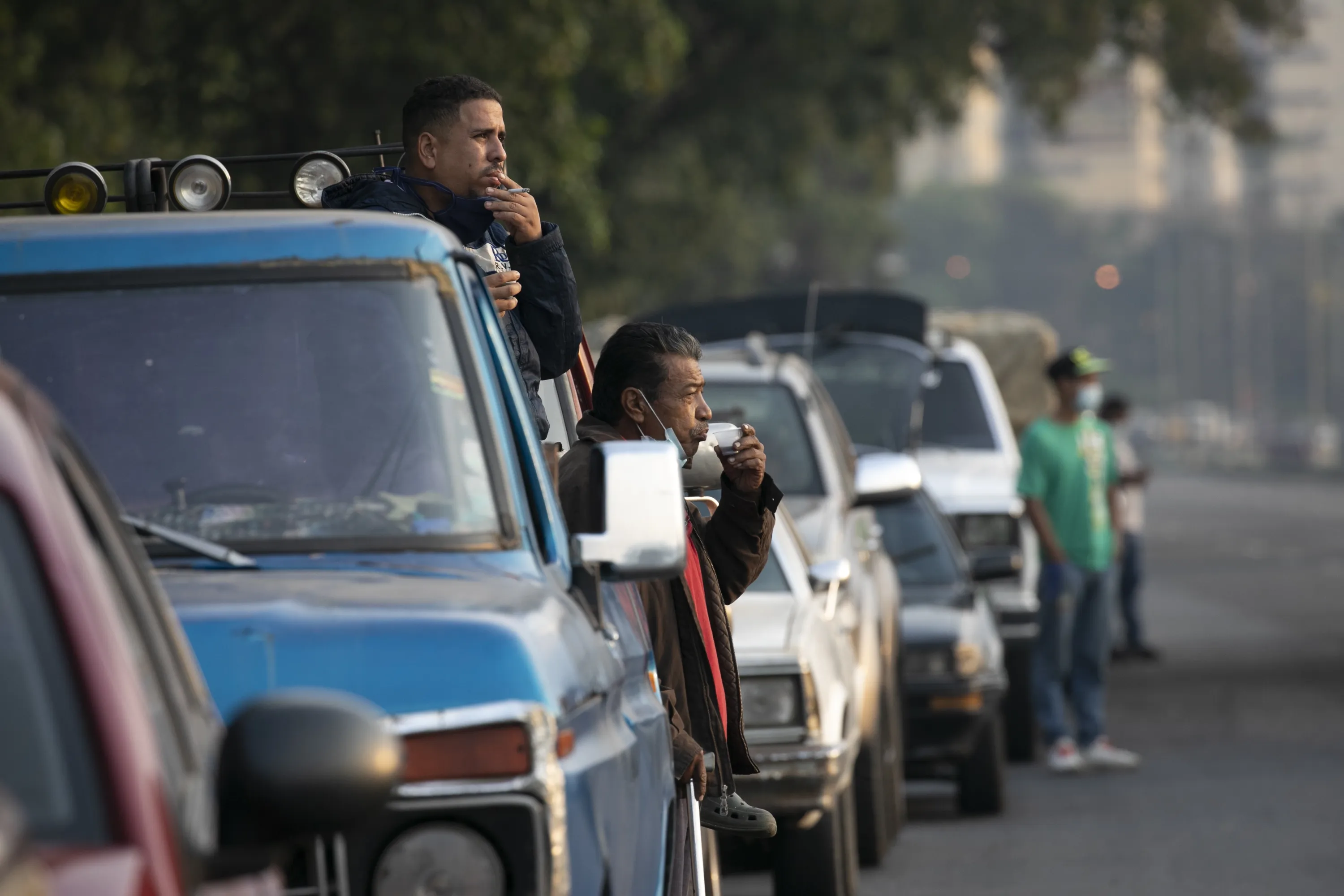 Men stand close to their vehicles as they wait for hours to fill up with gasoline in Caracas, Venezuela, Thursday, April 02, 2020. Lines at gas stations around the country's capital are getting longer and longer with some citizens saying it was only this bad during the oil worker's strike of 2002. (Photo by Ariana Cubillos/AP Photo)