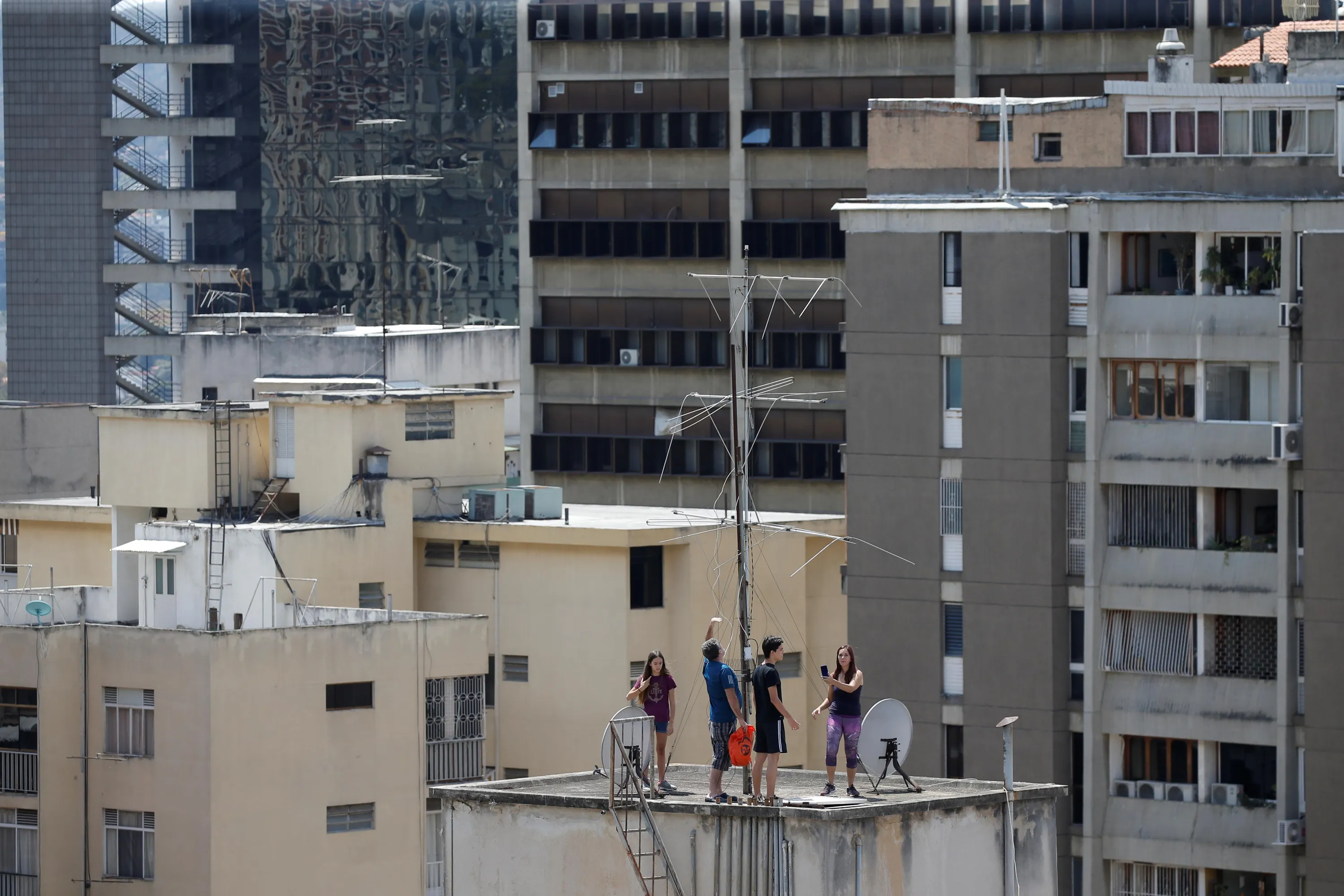 People gather at a rooftop in a residential building during the national quarantine in response to the spread of coronavirus disease (COVID-19) in Caracas, Venezuela March 22, 2020. (Photo by Manaure Quintero/Reuters)
