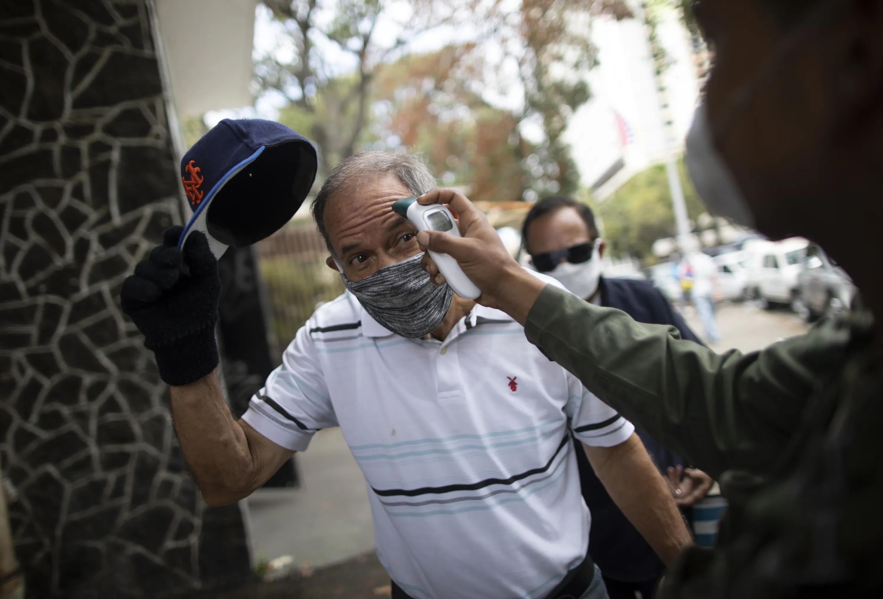 A man removes his cap as a soldier takes his temperature outside a food market as a preventative measure against the spread of the coronavirus in Caracas, Venezuela, Thursday, March 19, 2020. To enter the market, people are required to get their temperature taken and disinfect their hands. (Photo by Ariana Cubillos/AP Photo)