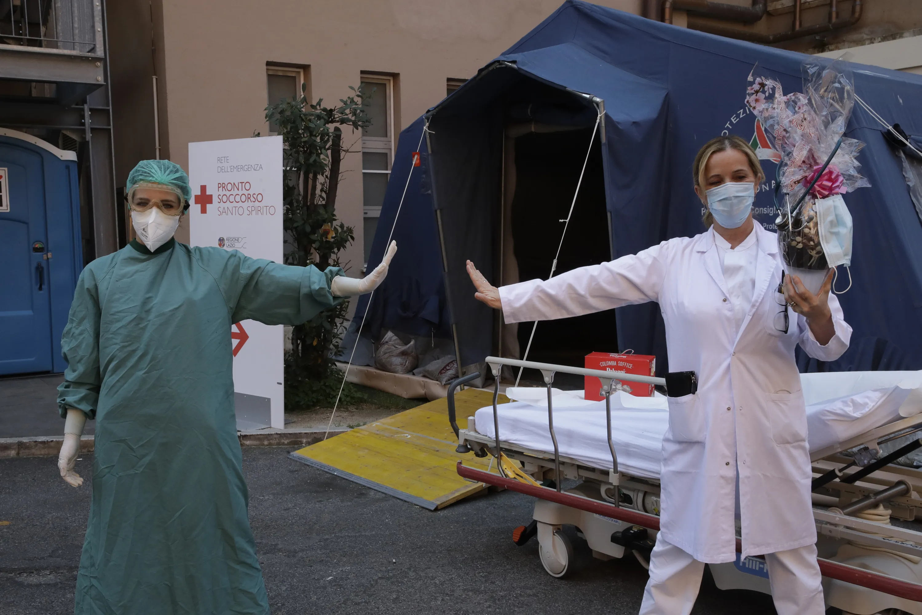 Monica Carfora, right, deputy head of the emergency of the Santo Spirito Hospital, which now has a separate emergency for possible covid patients, holds a chocolate Easter egg as she poses for a photograph with nurse Silvia Sforza, holding out their arms to indicating social distancing, outside the entrance to for covid emergency, in central Rome, Sunday, April, 12, 2020. (Photo by Alessandra Tarantino/AP Photo)