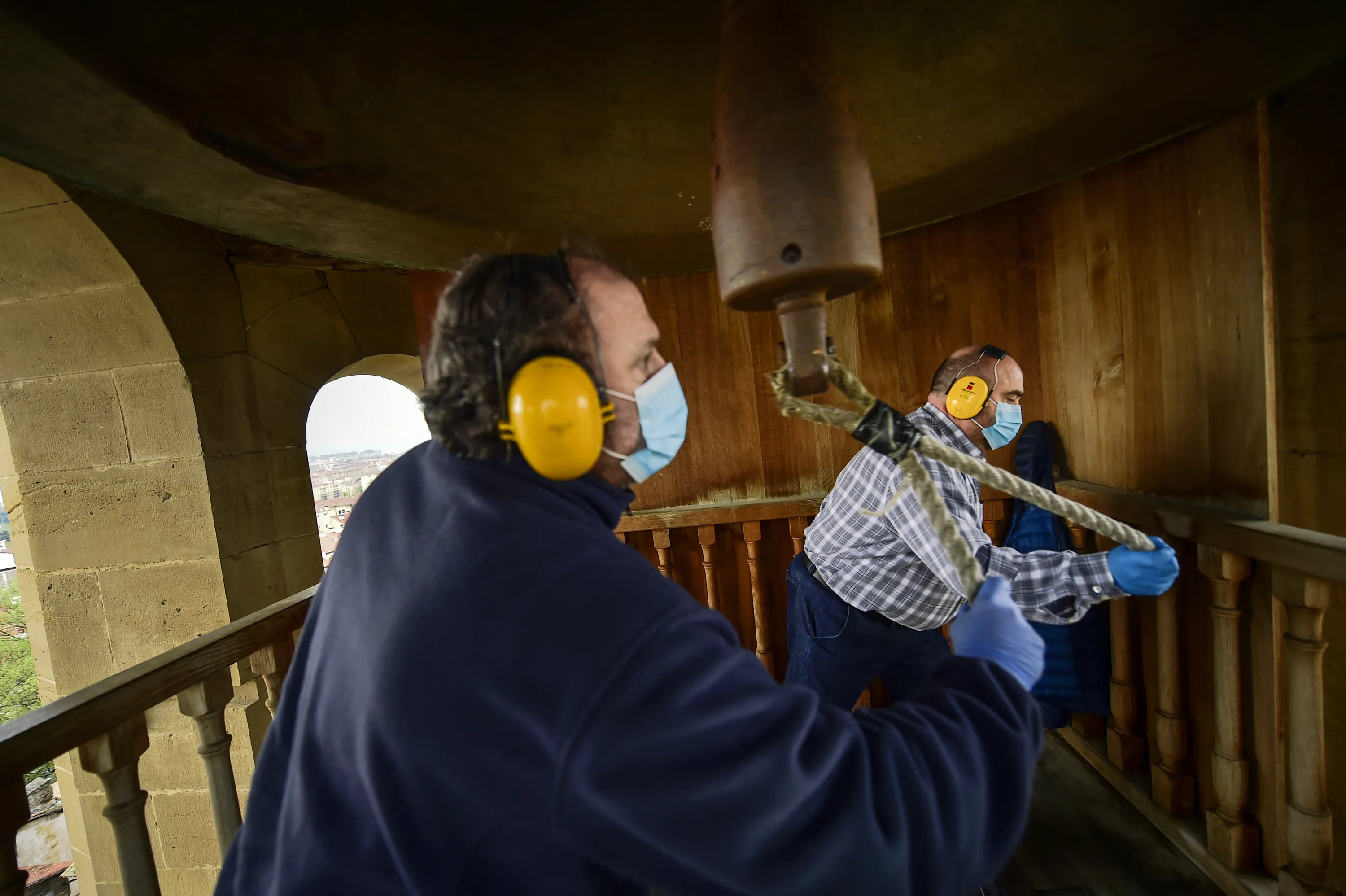 Bell ringers Patxi Martinez and Pedro Ros, right, wear face masks as they ring the bell at Santa Maria Cathedral in remembrance of those who have died from coronavirus, during Easter Sunday, in Pamplona, northern Spain, Sunday, April 12, 2020. (Photo by Alvaro Barrientos/AP Photo)