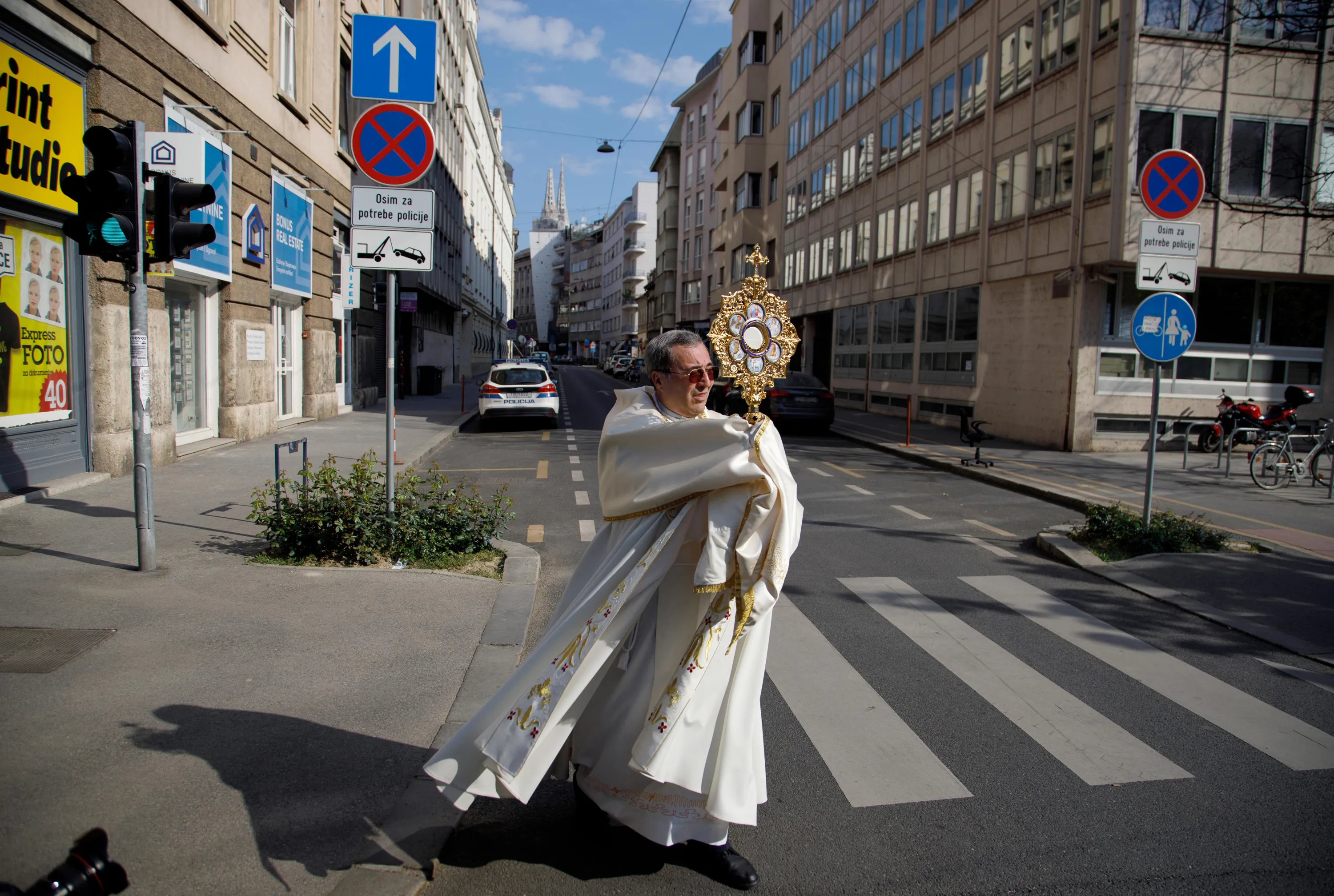 Priest Ivan Matic walks with a cross and blesses believers during Easter, amid the coronavirus disease (COVID-19) outbreak and in the aftermath of the earthquake that hit the country on March 22, in Zagreb, Croatia on April 12, 2020. (Photo by Antonio Bronic/Reuters)