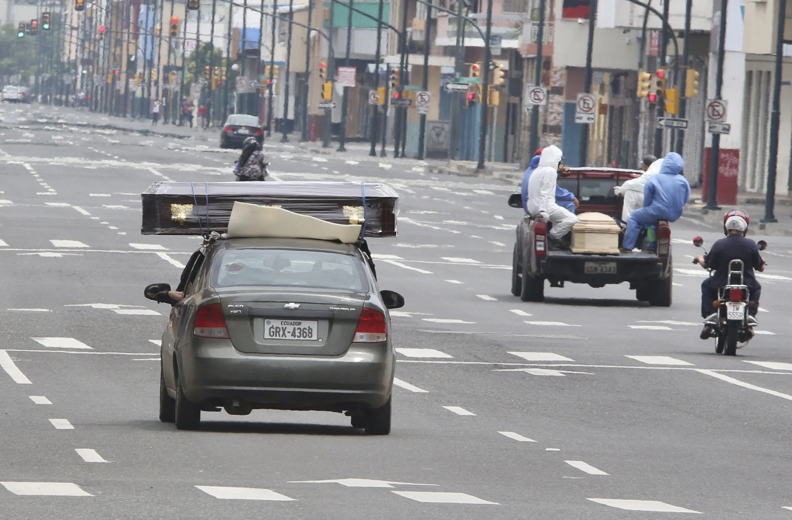 A car and a truck transport coffins containing the remains of people who are believed to have died from complications related to the new coronavirus, to a cemetery in Guayaquil, Ecuador, Saturday, April 11, 2020. Ecuador was one of the first nations in the region to identify a coronavirus case. Experts say it may offer a frightening glimpse of what awaits Latin America in the coming weeks and months. (Photo by Luis Perez/AP Photo)