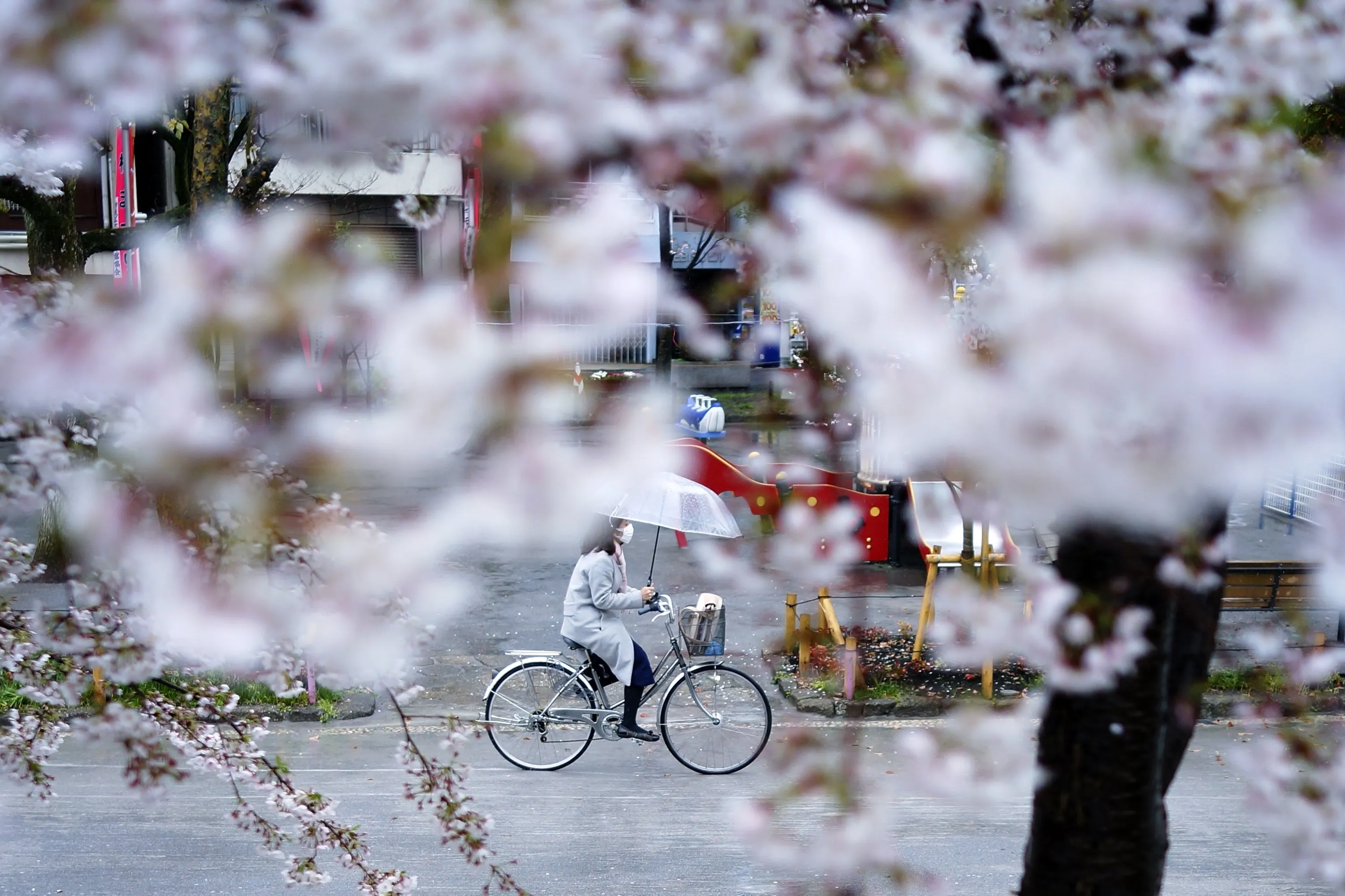 A woman wearing a protective face mask to help stop the spread of the coronavirus rides a bicycle past blooming cherry blossom trees Wednesday, April 1, 2020, in Tokyo. (Photo by Eugene Hoshiko/AP Photo)