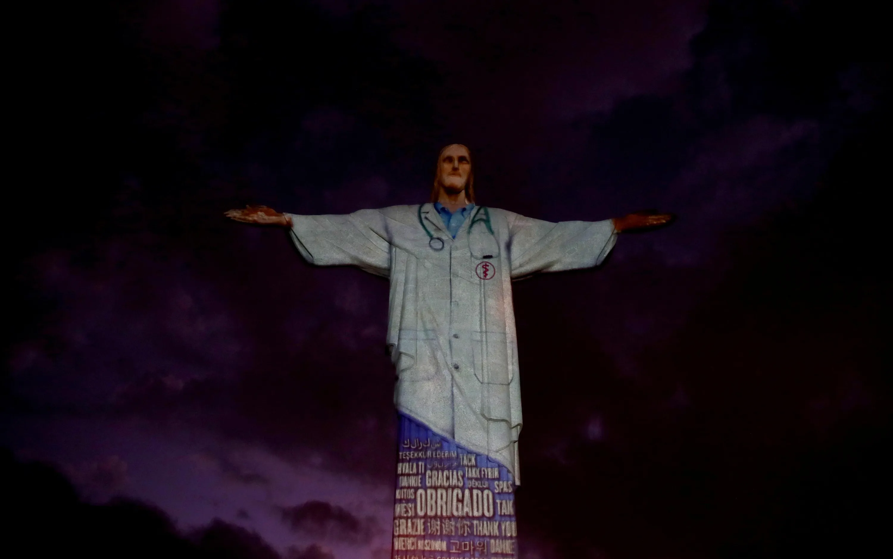 The statue of Christ the Redeemer is lit up with the image of a medical scrub and the word “thank you” in different languages during an Easter Sunday event amid the coronavirus disease (COVID-19) outbreak, in Rio de Janeiro, Brazil on April 12, 2020. (Photo by Ricardo Moraes/Reuters)