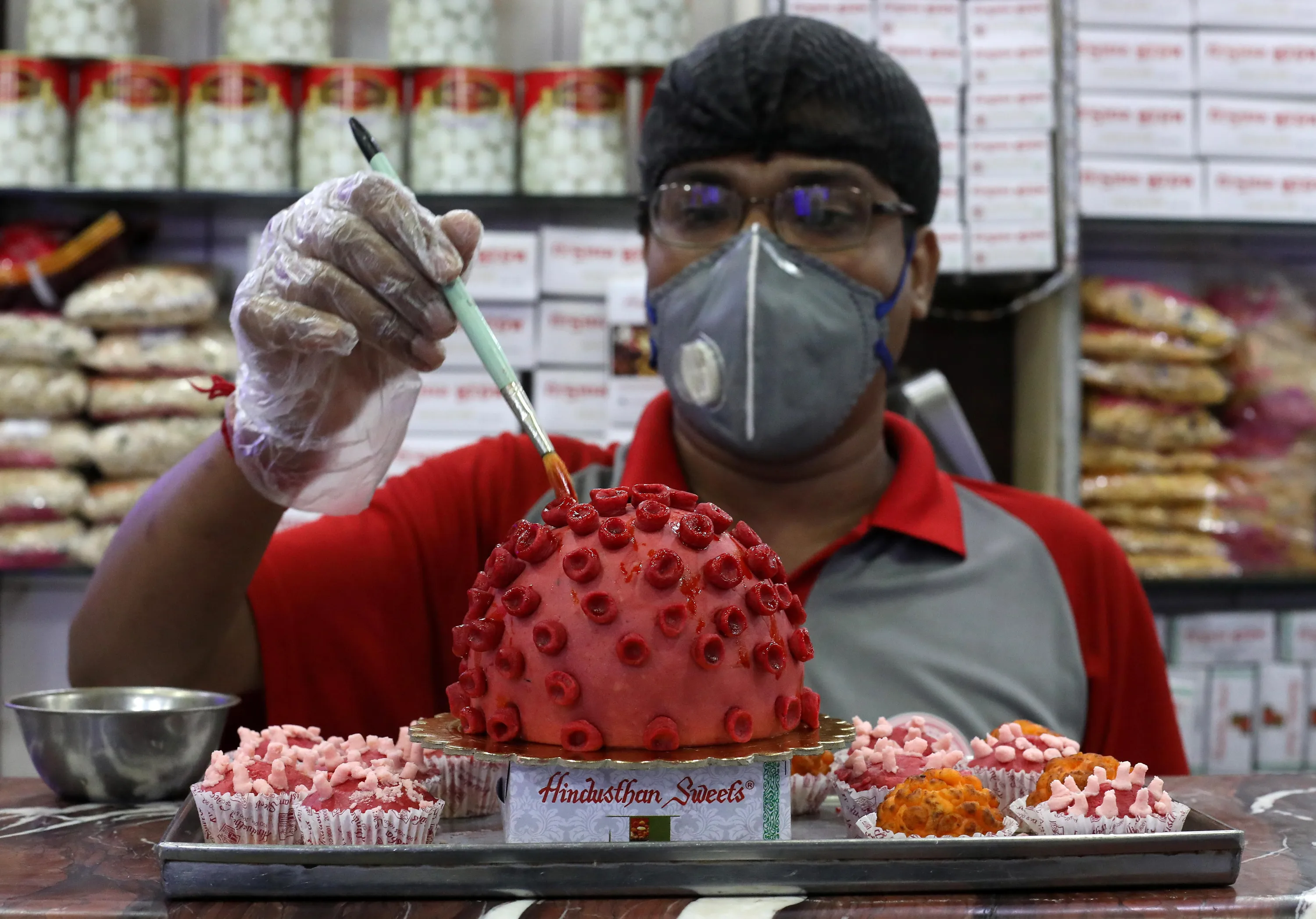 A confectioner applies finishing touches to a replica of coronavirus made out of sweets at a confectionary workshop during a 21-day nationwide lockdown to slow the spreading of coronavirus disease (COVID-19) in Kolkata, India, April 6, 2020. (Photo by Rupak De Chowdhuri/Reuters)