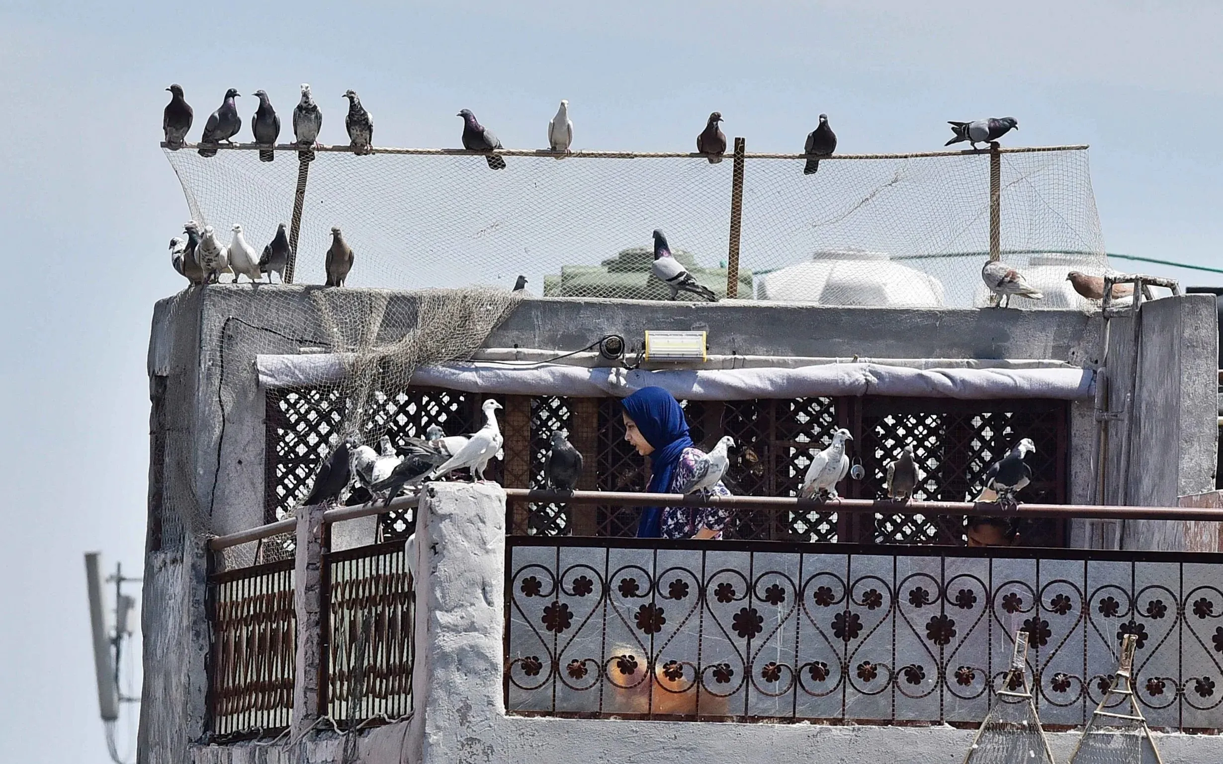 A woman is pictured on her rooftop with a cluster of pigeons on day ten of the 21 day nationwide lockdown to curb the spread of coronavirus on April 3, 2020 in New Delhi, India. (Photo by Sanjeev Verma/Hindustan Times/Rex Features/Shutterstock)