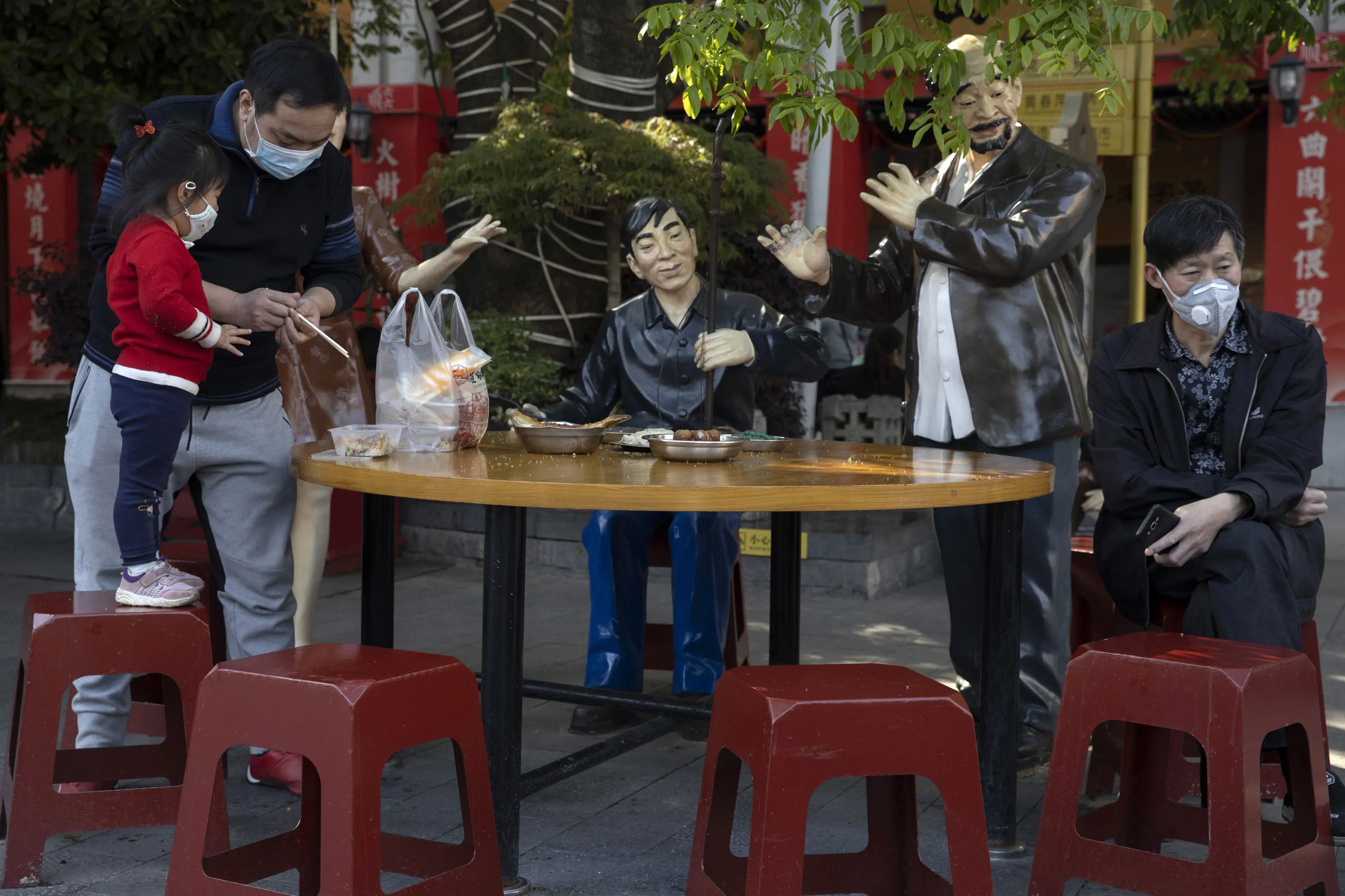 Residents wearing masks to help curb the spread the coronavirus rest among statues depicting normal life along a retail street in Wuhan, central China's Hubei province, Thursday, April 9, 2020. (Photo by Ng Han Guan/AP Photo)