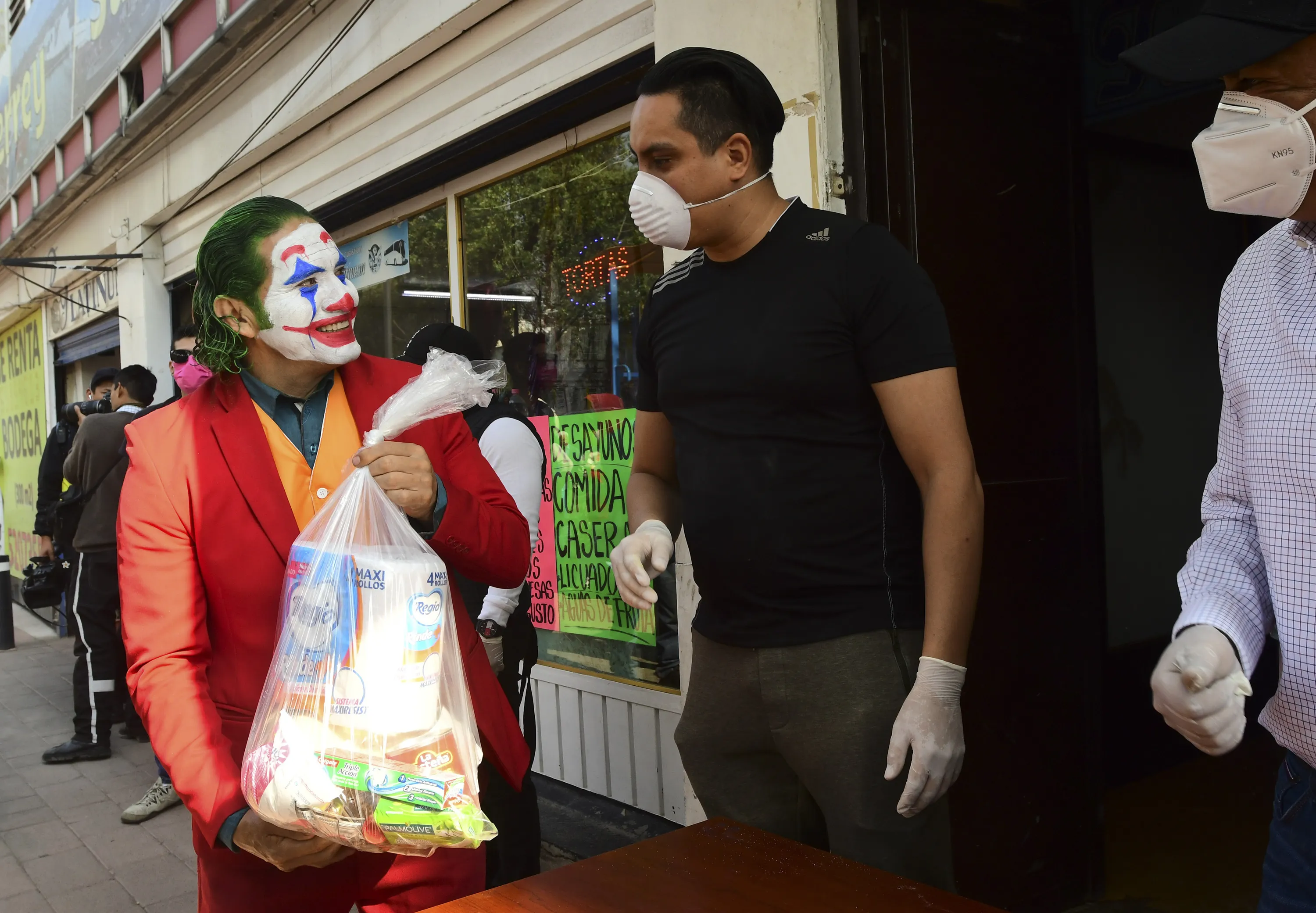 Urban entertainment artists, who developed their skills in the historic center, await the delivery of food support for the lack of employment due to the coronavirus disease (COVID-19) pamdemic, in Mexico City, Mexico, 16 April 2020. (Photo by Jorge Nunez/EPA/EFE/Rex Features/Shutterstock)